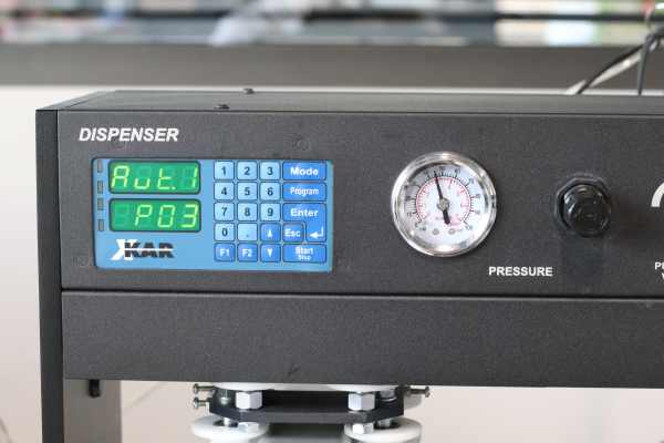 With your hands you guide precisely the syringe and with your foot you press a foot remote do dispense the paste, depending on the mode one press will dispense a small drop or as long as you press it will continously dispense the solder paste.