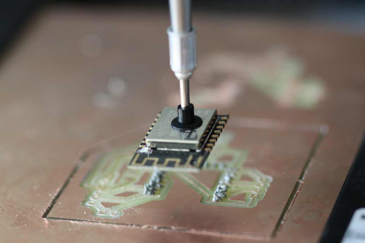 With the pick, I grab the ESP12F. With a knob you can rotate precisely the component and position it just above the place the footprint.