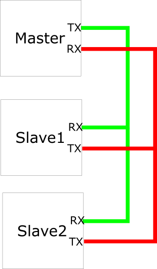 The master send “1” on the TX wire, the twos board received it on their RX wire, only the first board light up, then the master wait 2 seconds, then the master send “2”, the first board switch off the LED and the second board switch on the LED.