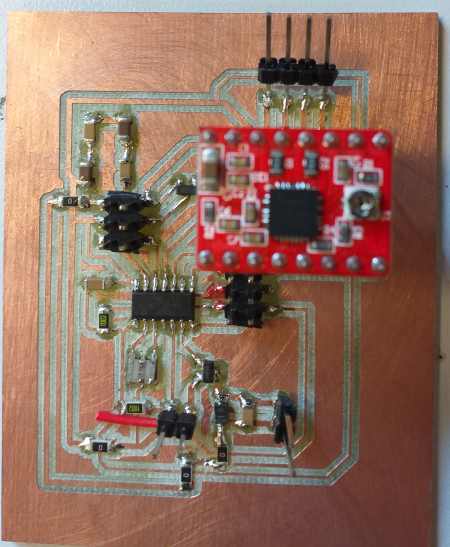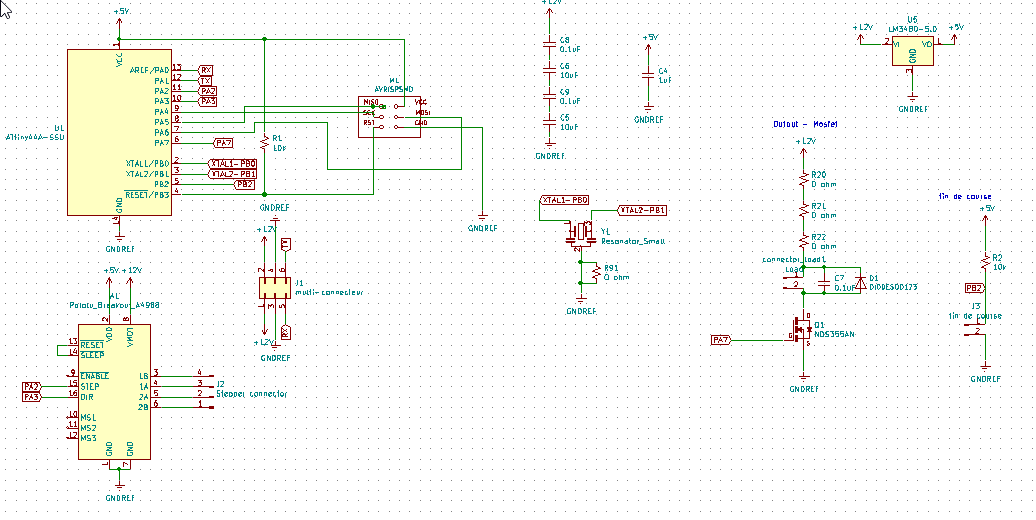 We decided to have a common 12V power. I will need the 12V to power the stepper but also the DC motor. But the microcontroller AtTiny 84 must be powered by a 5V.