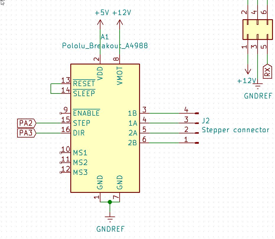 As described by the constructor the reset and sleep pin should be connected together. This component needs also a 5V for the logic parts. And of course the main power to power the stepper, in this case 12V. It outputs on 4 pins to control and power the motor.