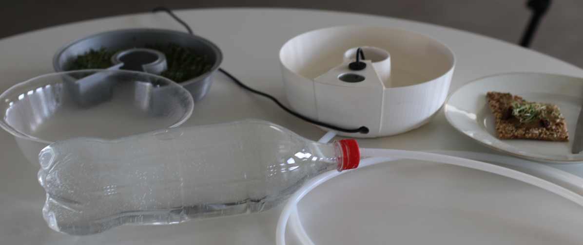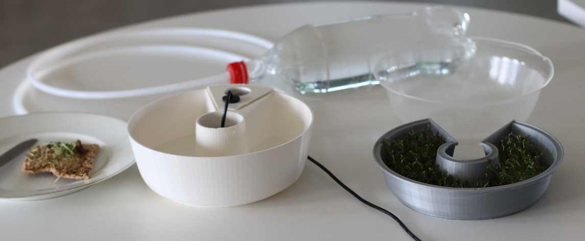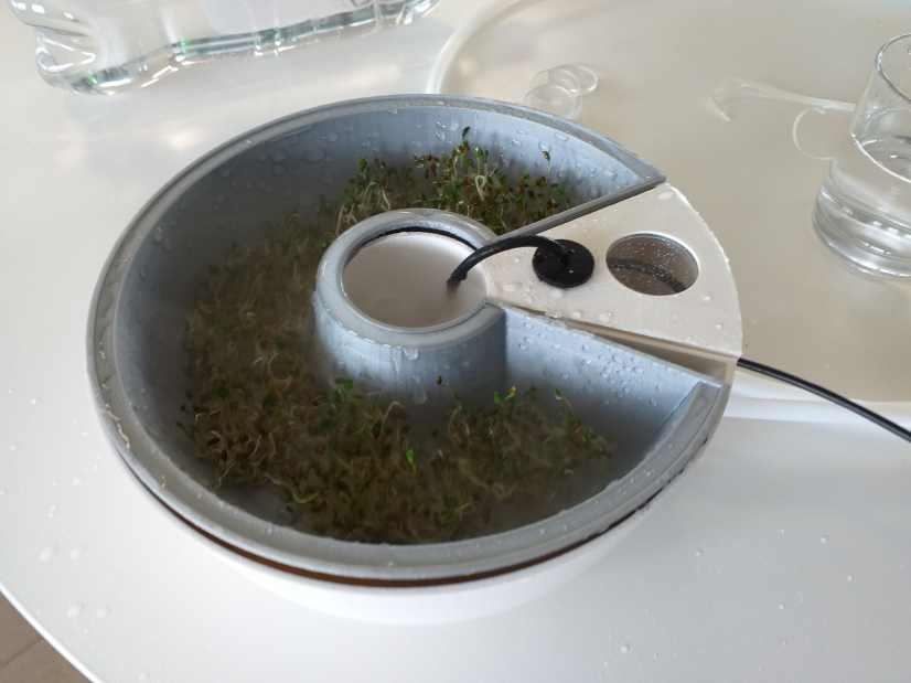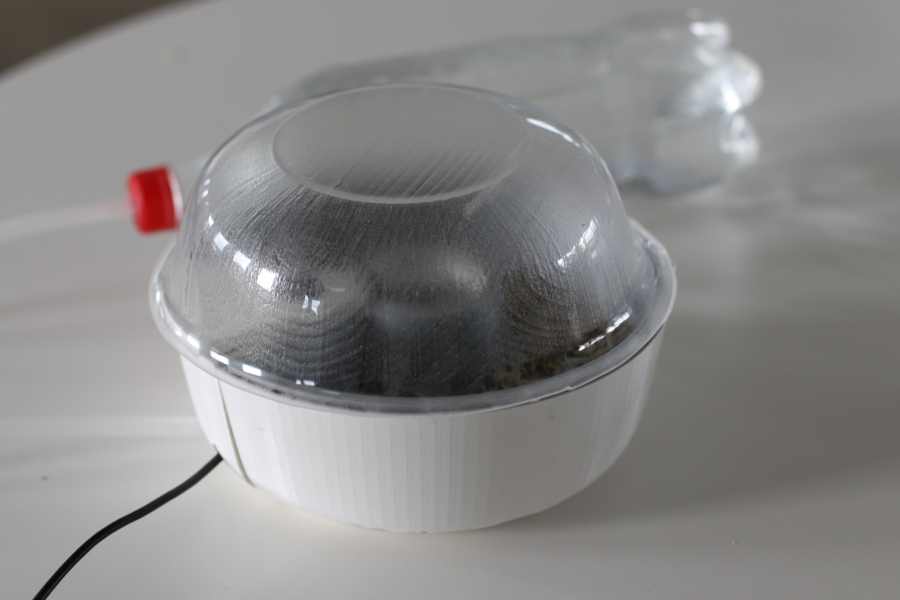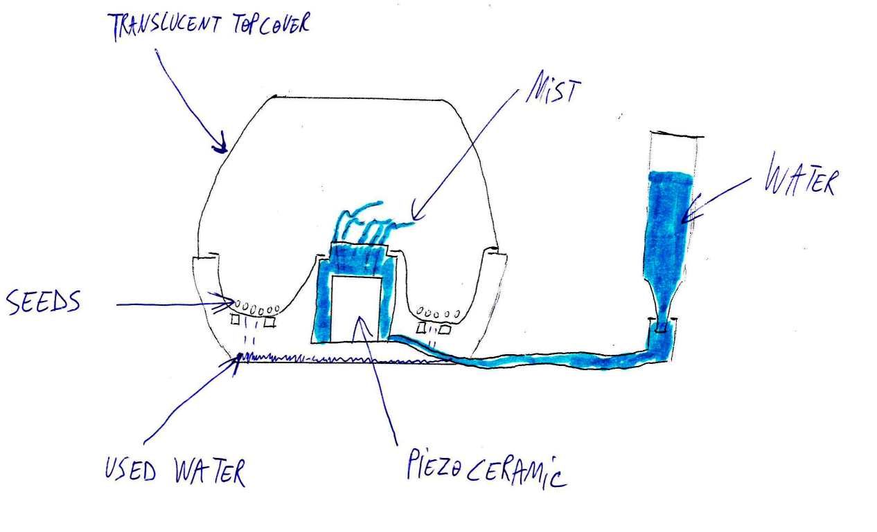 I build an enclosure to keep the mist and the warm generated by the seed. It has to be translucent, the seed needs a small amount of light. Water comes from a simple reused bottel. Communicating vessels is enough to fill the internal water tank.