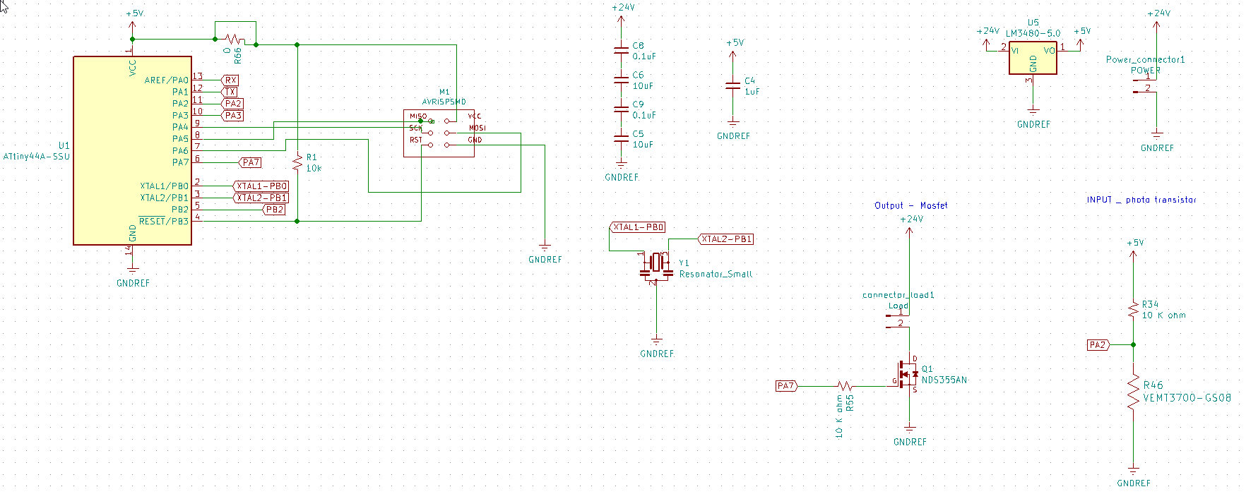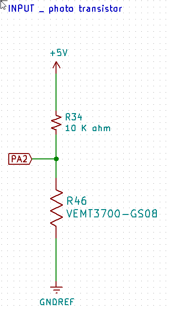 Input : Phototransistor. As explained in week 12 , the symbol of the VEMT3700 is not correct in KiCad. It is symbolized by a resistor but it is a phototransistor.