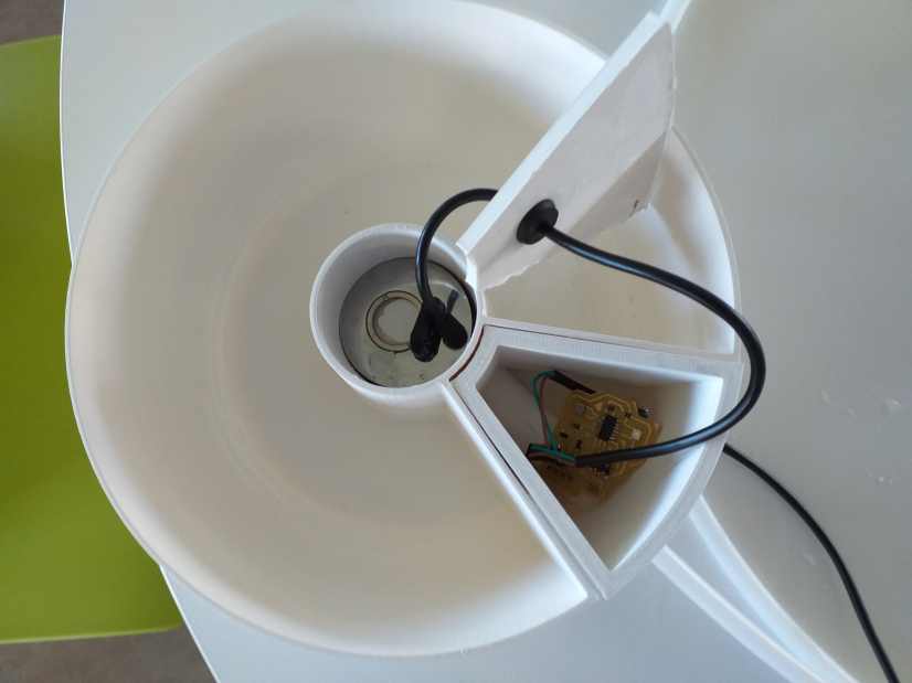As you can see in this picture; The piezo electric element is lying in the middle of the bottom part. The electric cable goes through a rubber piece sealed in the top cover electronic part. The Plexiglas 30mm circle protect from humidity but let the light shine on the electronic.