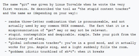- Torvalds quipped about the name git (which means unpleasant person in British English slang): "I'm an egotistical bastard, and I name all my projects after myself. First 'Linux', now 'git'. The man page describes Git as "the stupid content tracker". The readme file of the source code elaborates further: