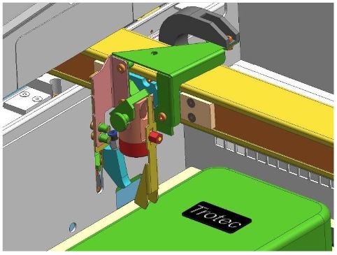 - 4/ Focus the Laser Beam : move the processing head over the material to be engraved by means of the positioning keys X/Y. Hang the focus tool on the external ring of the working head so that the focus tool can move unhindered. Move the working table upwards by pressing the Z positioning key. While doing this carefully observe the focus tool. Before the focus tool reaches the work piece, move the working table upwards only very slowly and step by step by briefly tapping the positioning key, until the tool tilts to the side. Now the lens is focused onto the surface of the material.