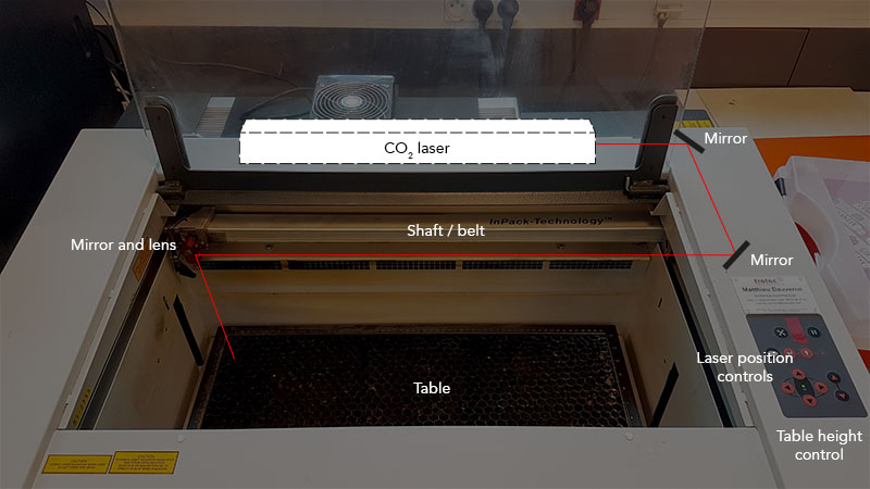 Our laser cutter works with a CO2 laser. The laser is first bounced on half-opaque mirrors, to accumulate power and then bounced off of regular mirrors (see picture below) until it finally reaches the lens. The lens then focuses the laser’s power on the surface of the material to cut.