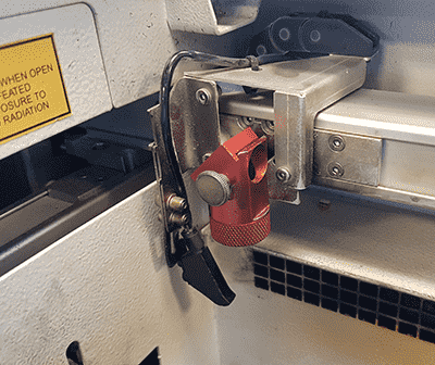 The focal distance is different for each lens, therefore, before using the laser you have to reset the table height accordingly with the help of a wedge (see pictures below). We’re using a 1.5 inch lens.