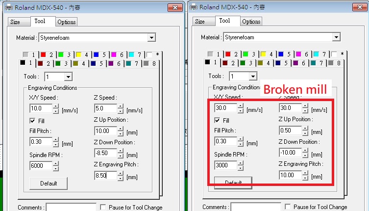 We try another setting, and break the end mill.