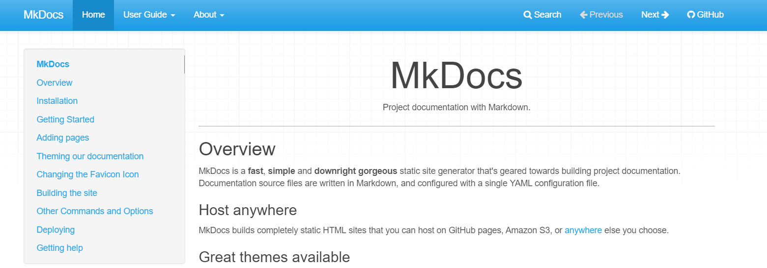 Before using Mkdocs, you need to install Python and install new Mkdocs using Pythons’ pip.