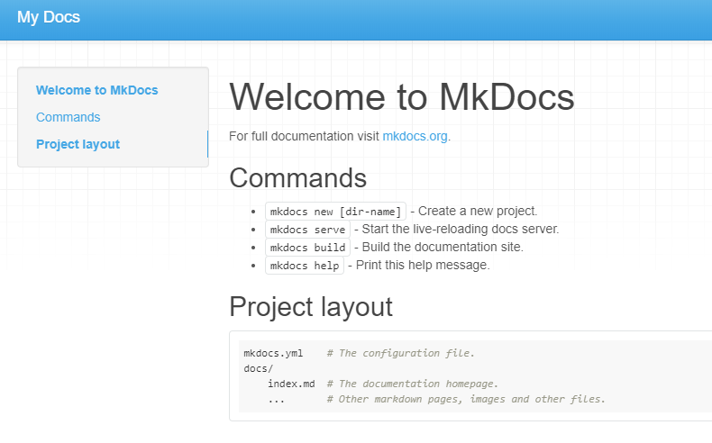 mkdocs new my-project cd my-project