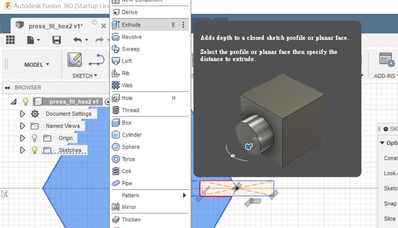 Extrudes the hexagon with ractangle.
