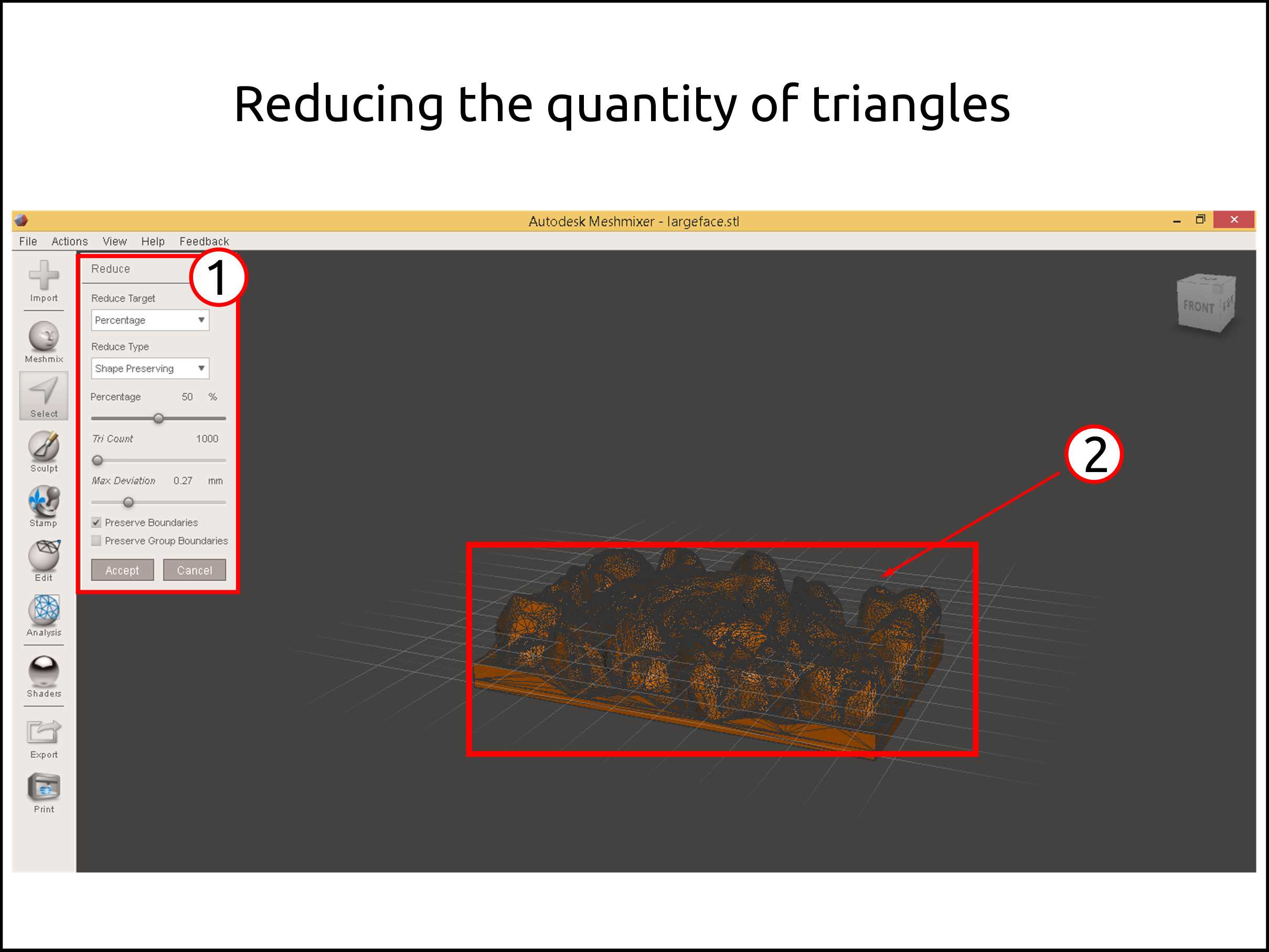 The first step was to reduce the number of triangles using the software called MeshMixer using its tool called Reduce.
