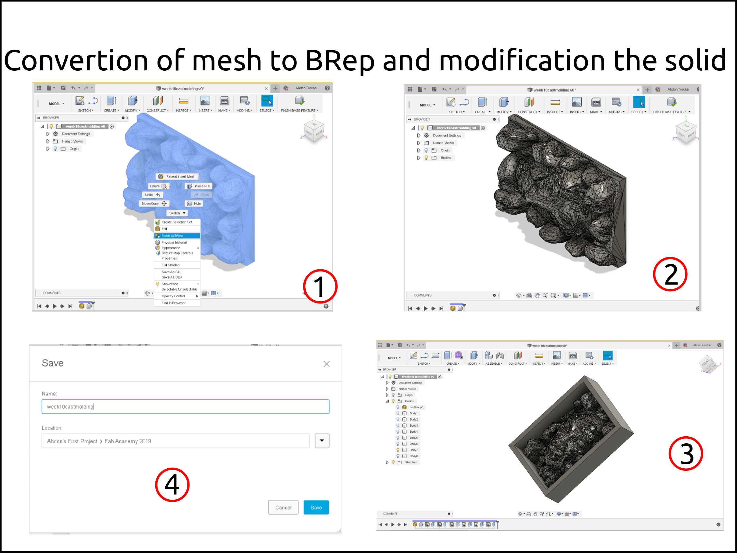 Individual assignment: Design a 3D mold around the stock and tooling that you’ll be using, mill it (rough cut + (at least) three-axis finish cut), and use it to cast parts.