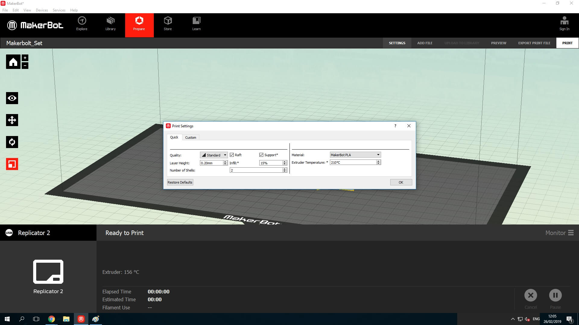 Then, load the STL. file in the Makerbot print software, but in this case, in print settings add raft and support (because the sword was in the air) and the infill was 15%.