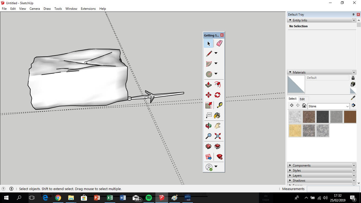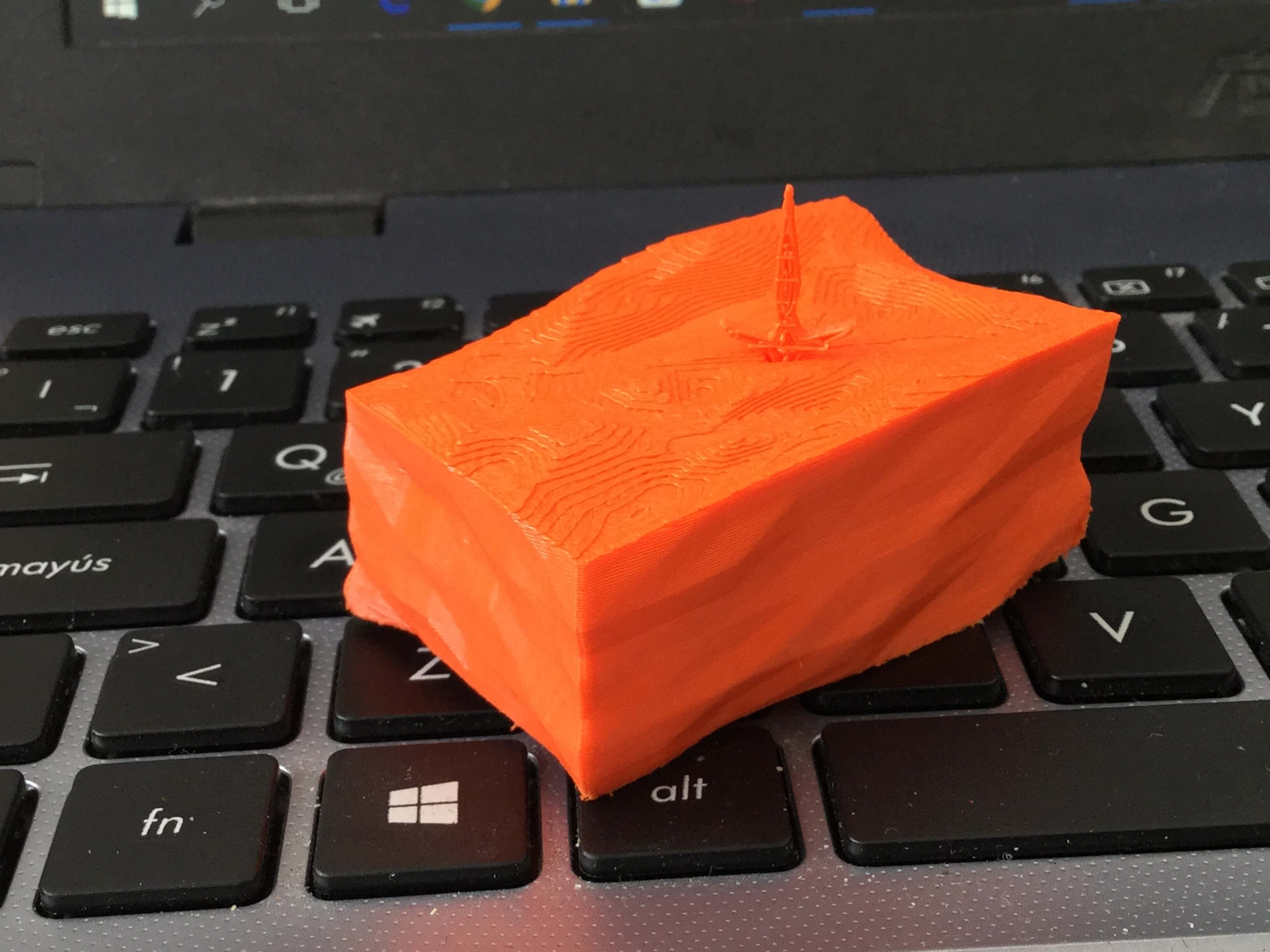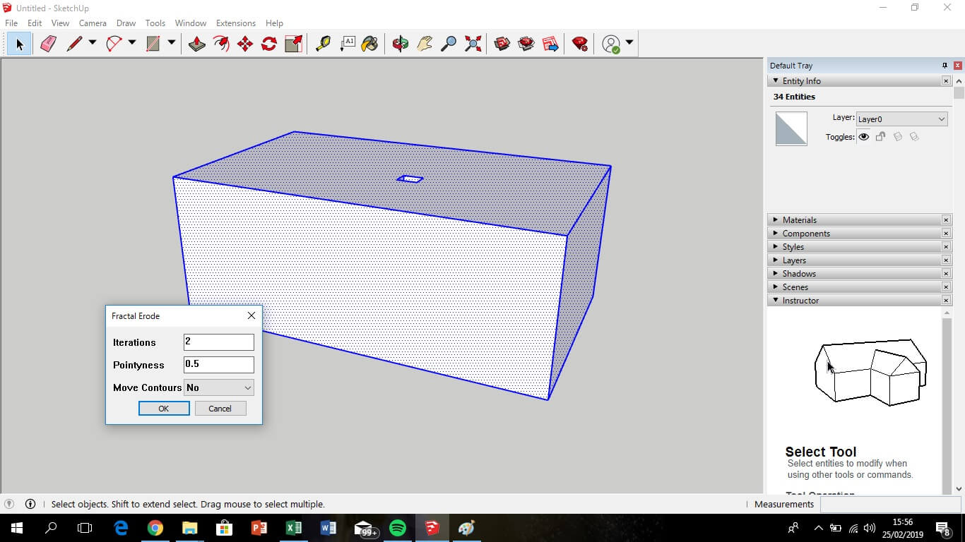The second assignment consists of the design and prints a 3d object that can't be done by the subtractive process, like laser cutting. For the design I use SketchUp, and add two plugins, one is "eneroth fractal terrain eroder" to give a solid type rock finish, and "STL Exporter" for convert the format. Use the comand intersect > intersect with model, for joint the two pieces of my design and print as one.