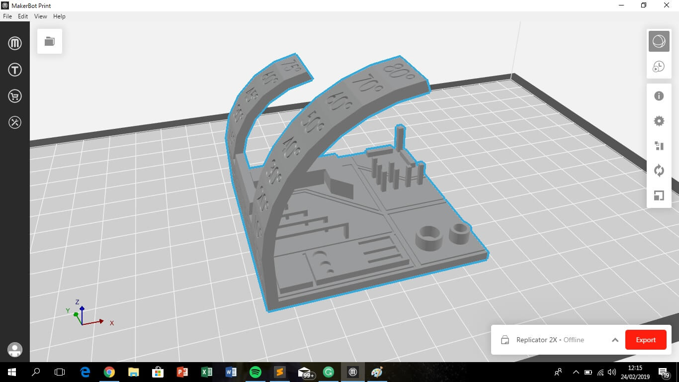 In the Makerbot Print software, first, load the ".STL" and then check some print features, like Infill Density: defines the amount of fill material, therefore, control the production time. We use 30%, i.e. the piece have only 30% of fill and 70% empty, and take about 2 hours. The rest of the features were left by default.