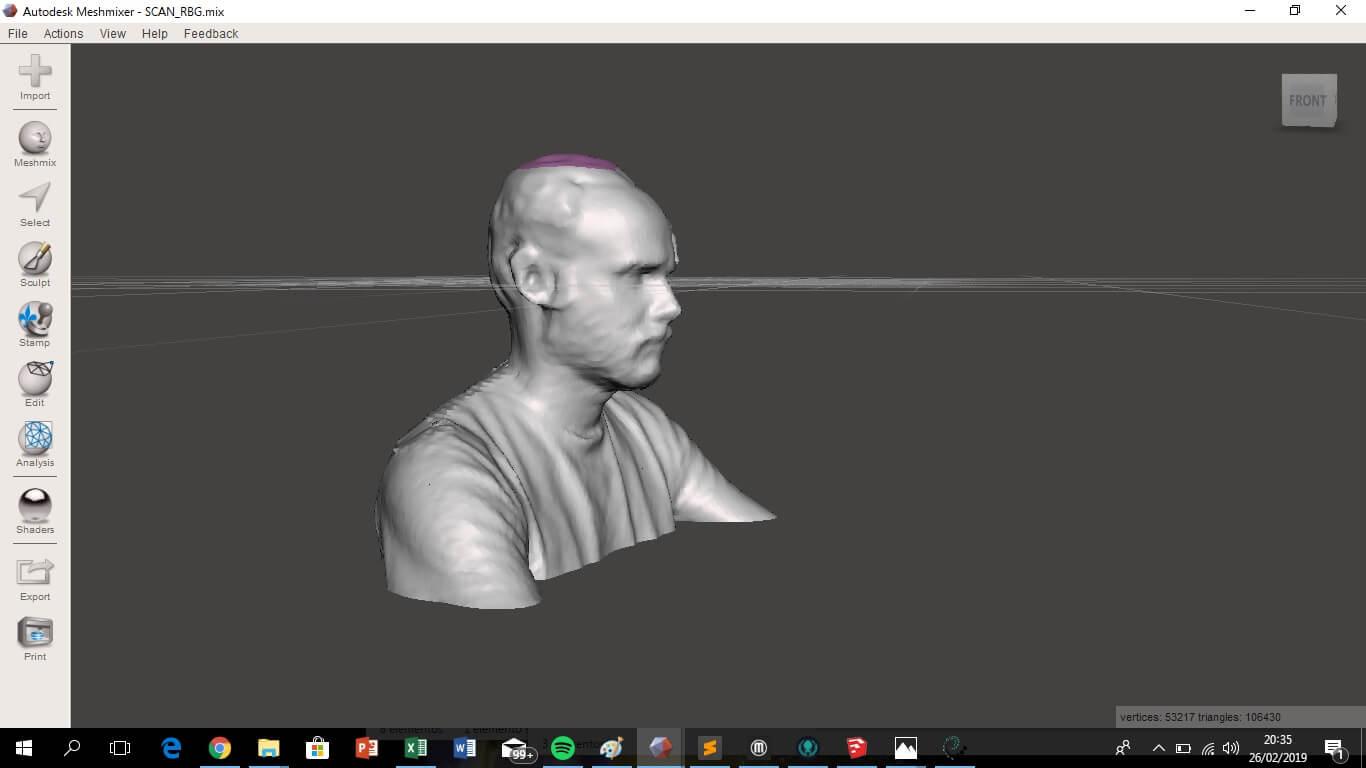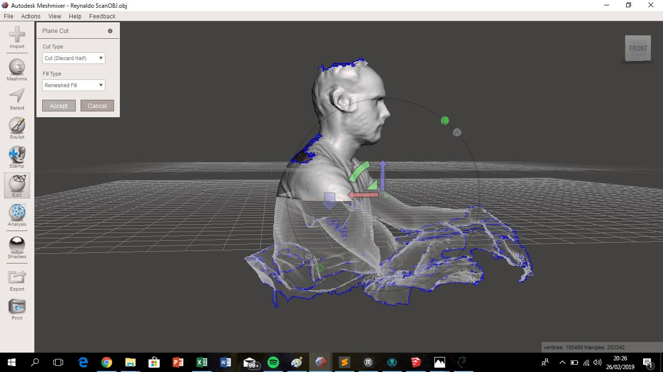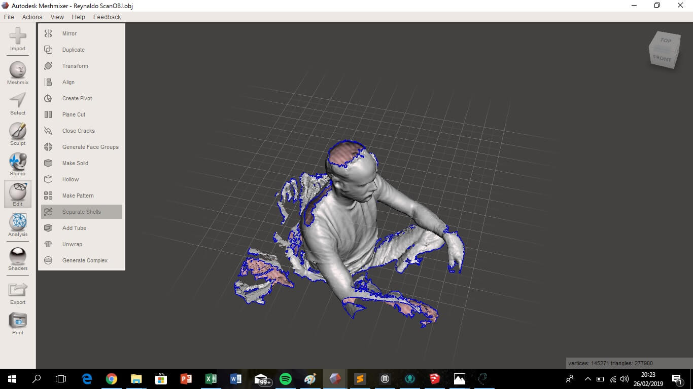 As the scan record more than necessary and did not capture some parts, some parts of the image had to be cleaned and reconstructed. For this I used Meshmixer, a free software that is quite simple. With three steps you can achieve an acceptable image, first use edit > separate shells, to separate the main image from the remainder, then edit > plane cut, to remove the excess of the main image and then analysis > inspector, to identify the holes and fill them.