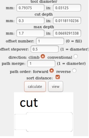 The parameters that must be entered are: diameter of the milling cutter (0.01 mm for milling and 1/32" for cutting), cut depth (here consider that the thickness of the copper layer must be traversed for milling, and for the cut through the Bakelite layer as well, so these thicknesses should be considered). With "offset number" indicates if you want to remove all excess copper or no (0 = remove all). The other parameters are related to the position of the geometrical cero of the mill.