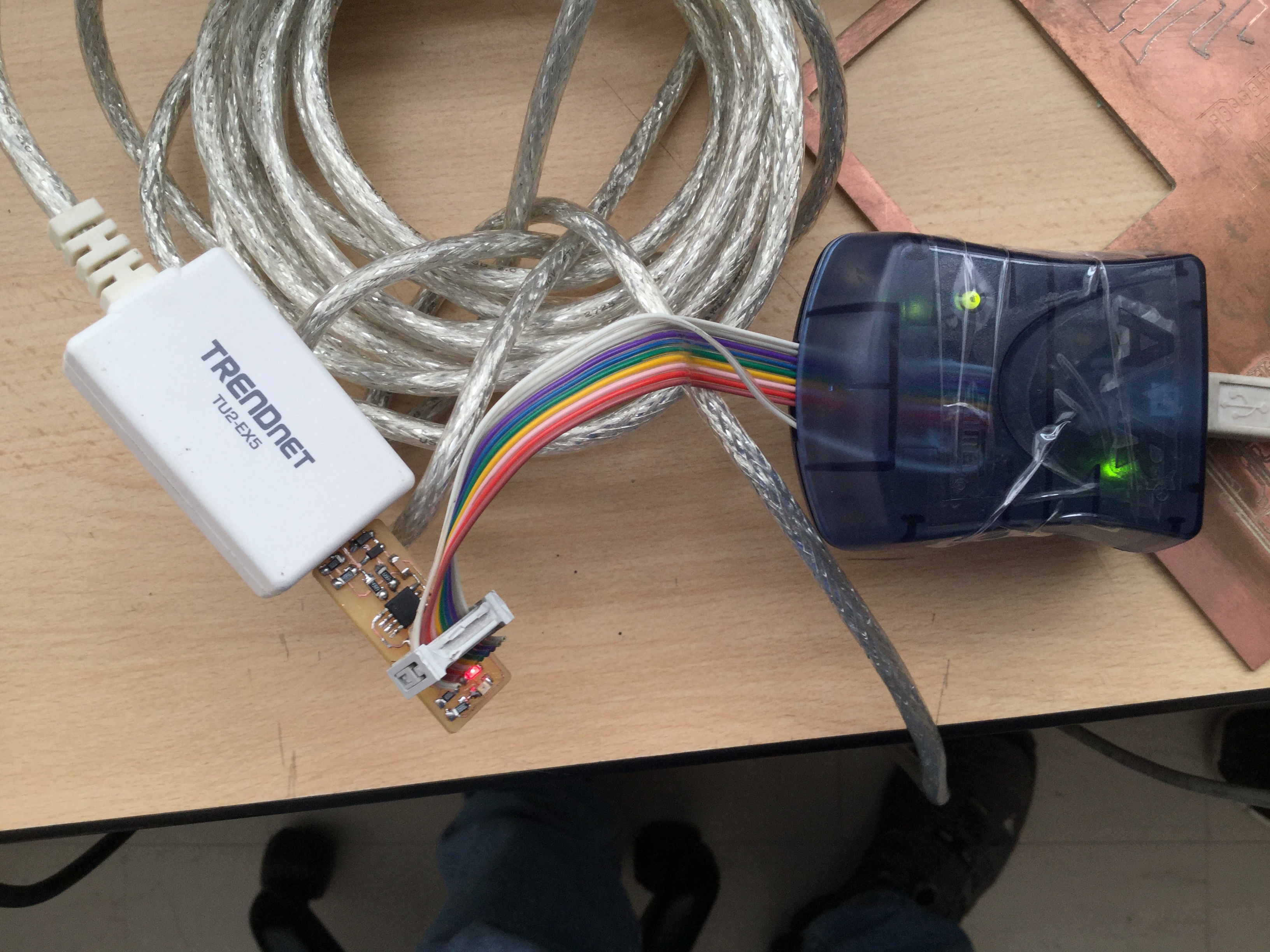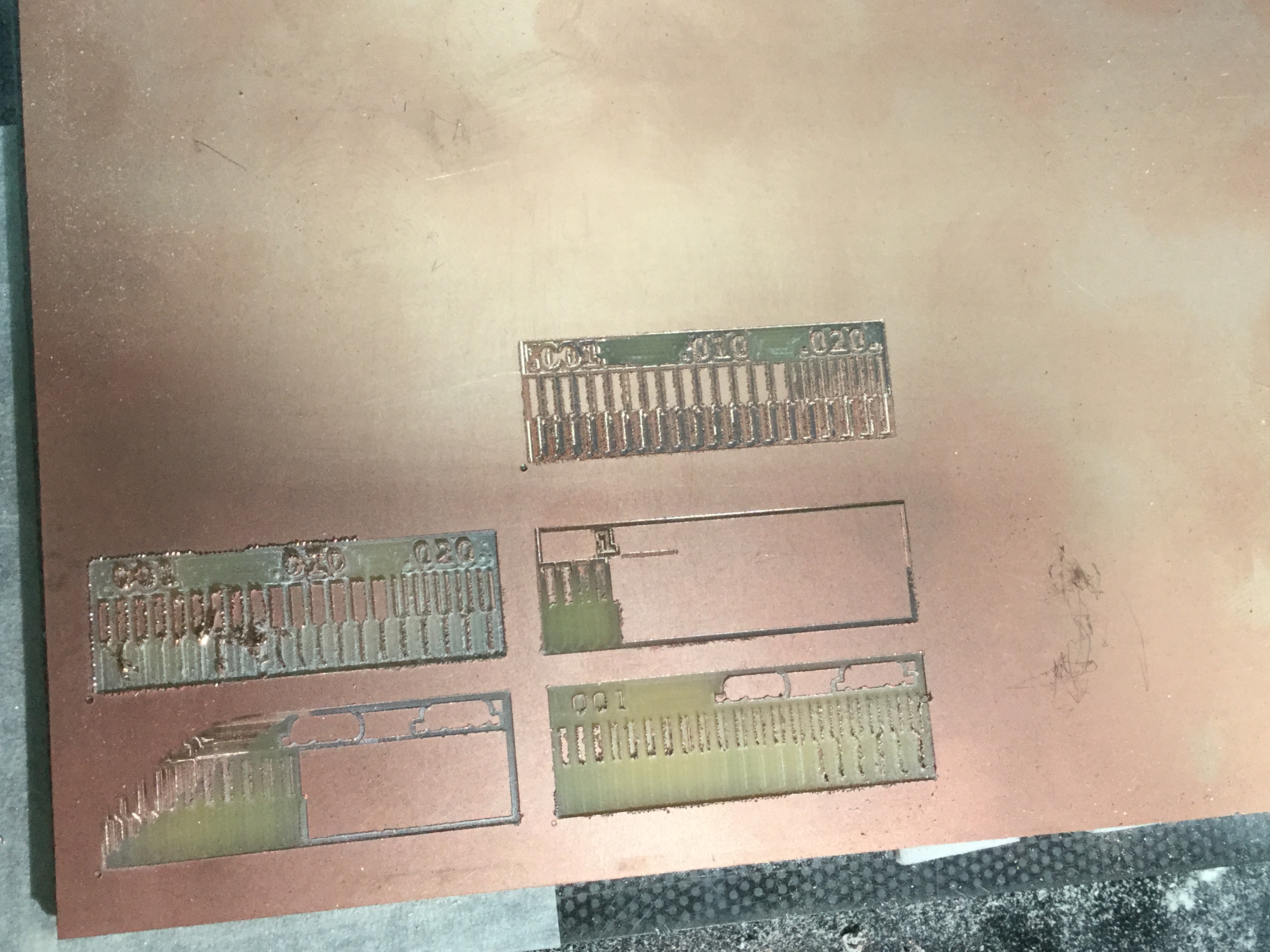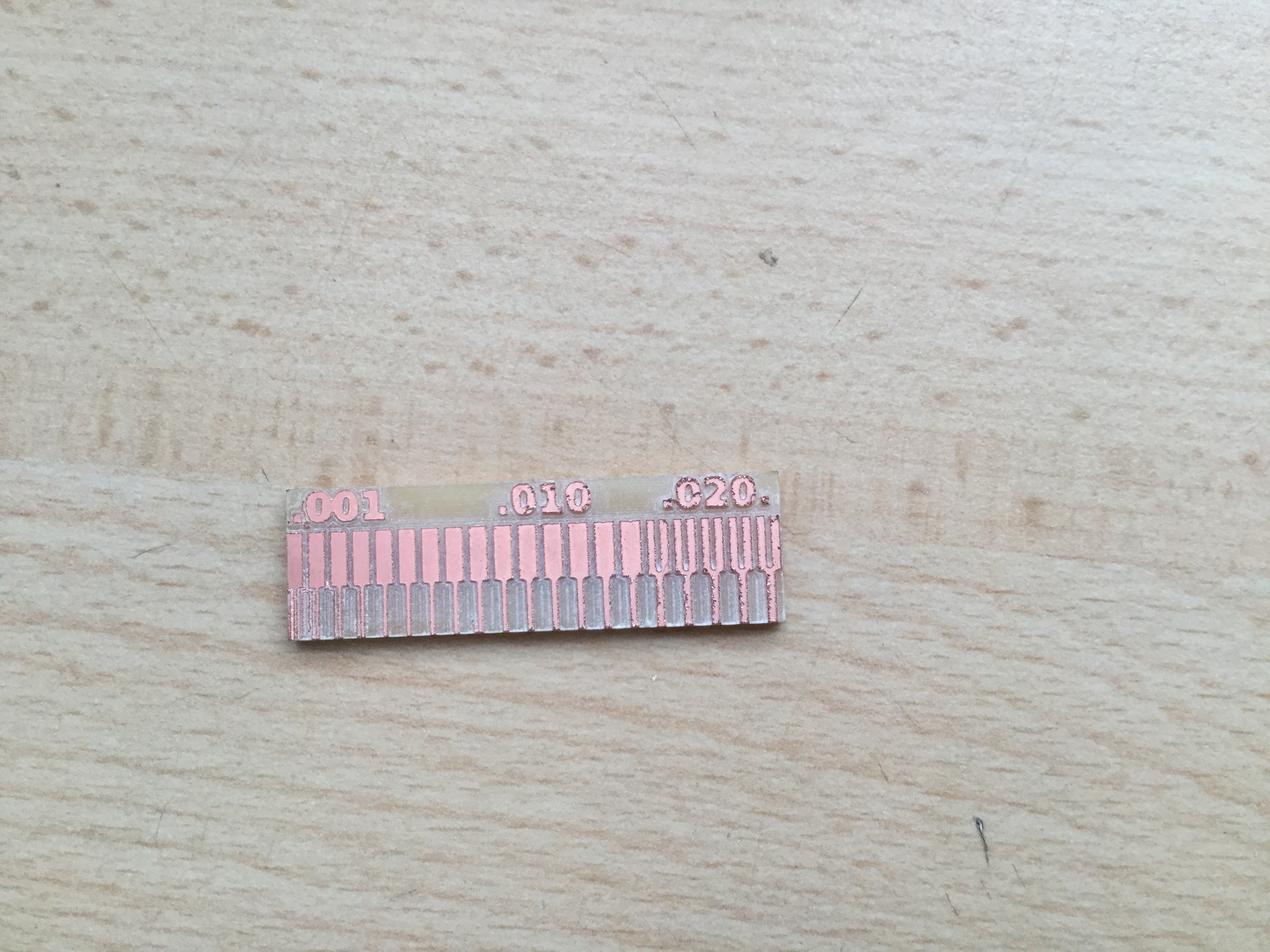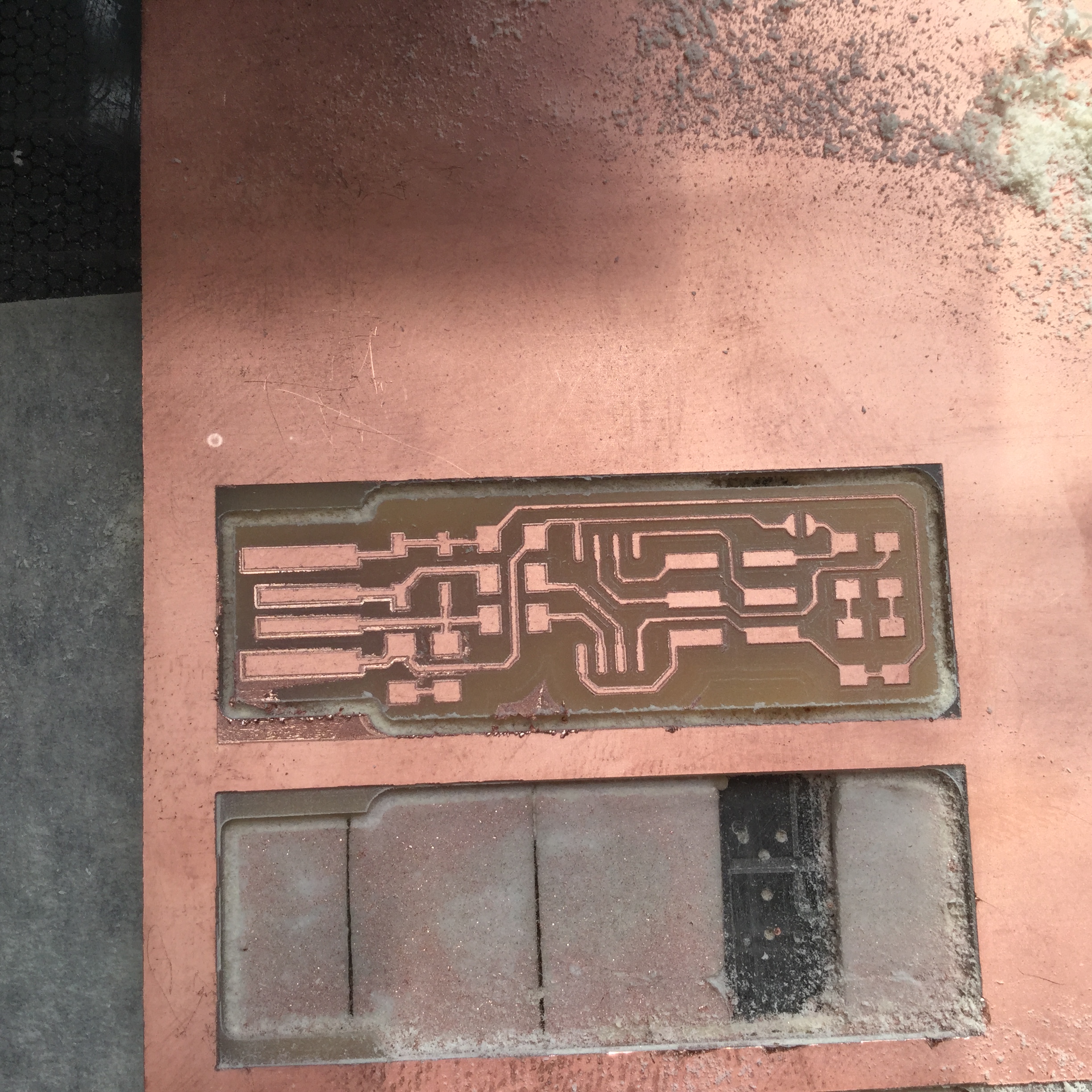 As see in the picture, the milling wasn't good enough, as a result of the inclination of the board due to the double side tape, so i have cut out a few the copper layer using a cutter. Finally the copper path seens good.