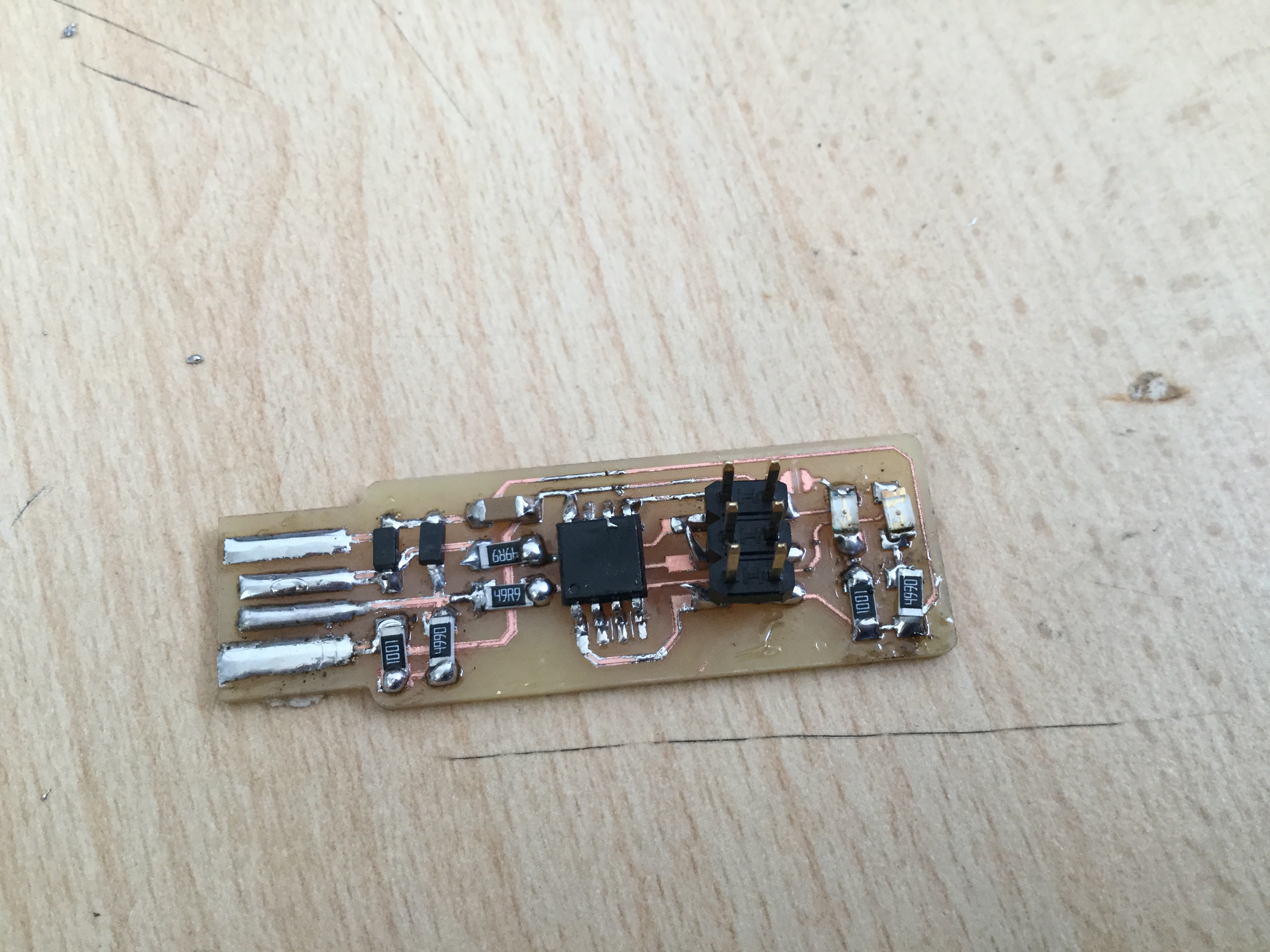 This was the final result. Then I used a multimeter to check if everything was properly soldered. I did this process twice, the first time I thought it was ok, but at the time of loading the program on PCB an error message came out, so I went back to check the circuit and found that I had two points that had not welded well , two pins of the ATtiny45 microchip, I had to add more tin and it was fine.