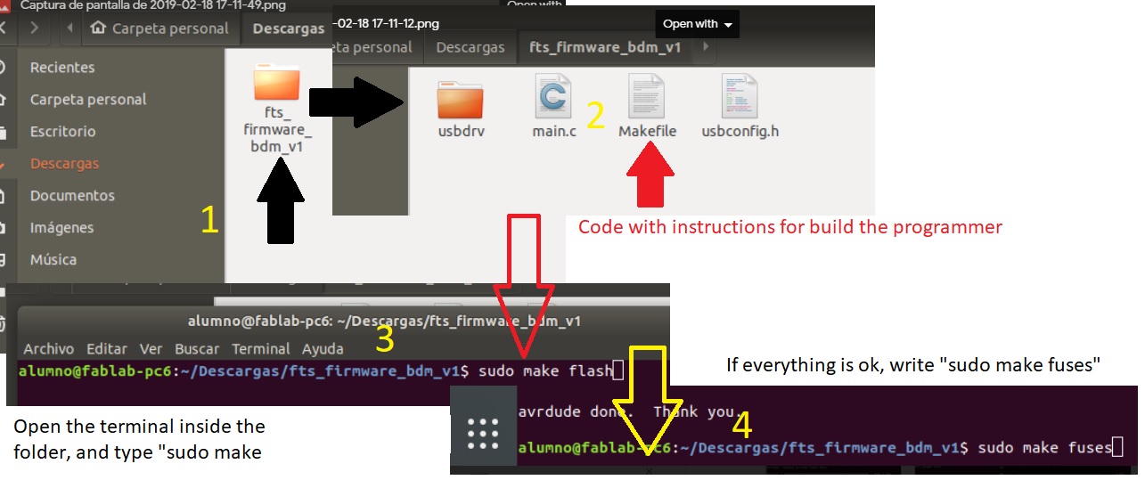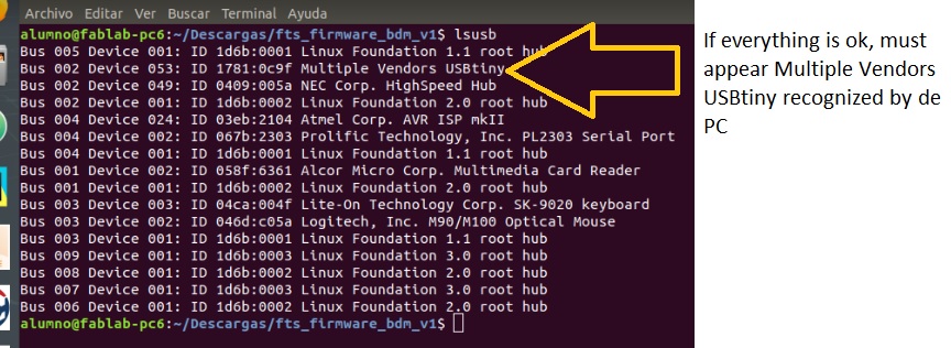 For programing, conect the PCB in a USB port of the computer, and at the same time conect the pin header to the ATMEL Small translucent blue programmer, if everything ins ok, the programer show two green lights