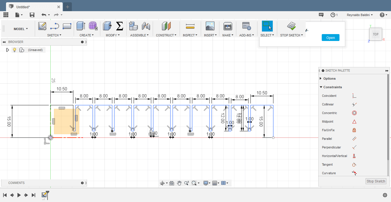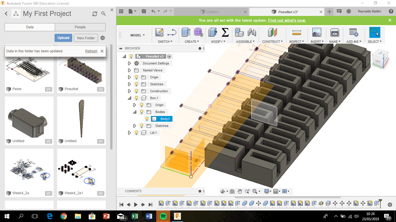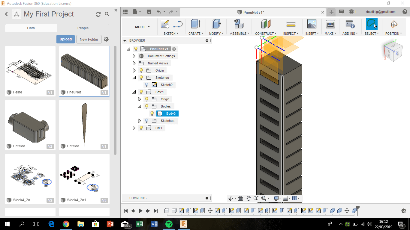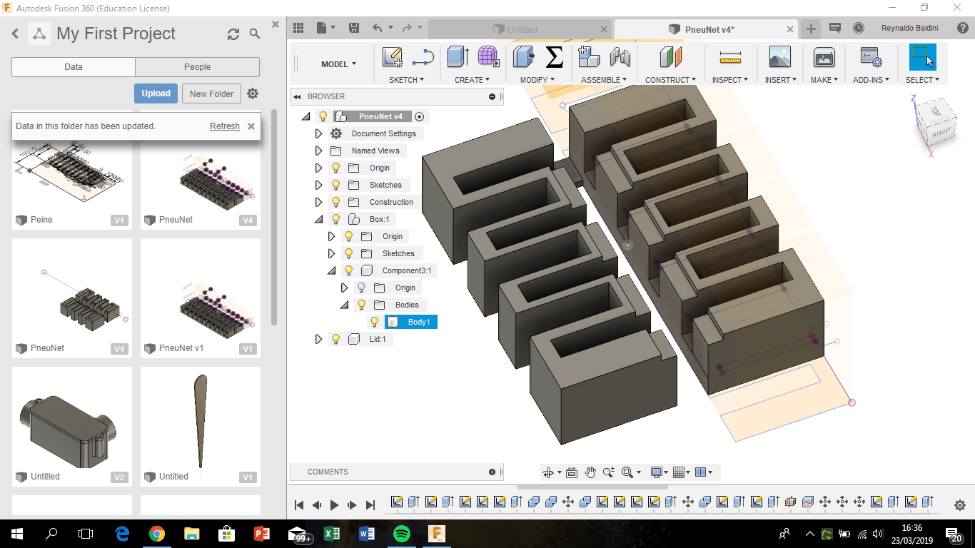 Then, I use Fusion 360 to design a piece, here I found the firsts two main restrictions: In my first design attempt I followed the instructions for design an "actuator" (a pneumatic piece) that has some distances of 1 mm, but the minimum available diameter of the flat end mill is 1/8" or 3.175 mm. The other restriction was the piece that I want to build needs to be machined on both sides, which could mean a tricky process. So I have to adapt the minimum distances in the piece to the diameter of the mill; and divide the piece in the midle through the xy plane and have machined only one side.