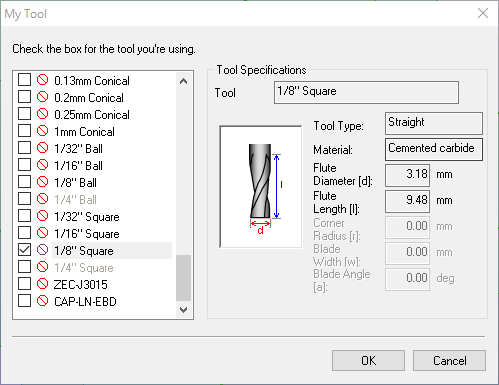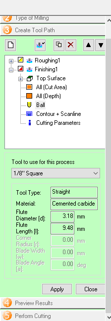 Click on "3. Create Tool Path", here define dimensions and the material of the block and the tipe of mill. I use a flat end mill of 1/8", for add a particular tool, go to "My Tools" and select the current tool, then go to edit and the tool appear in the Roughing and Finishing options, I use the same tool for the both, because I do not need a very detailed finish. The go to create a tool path.