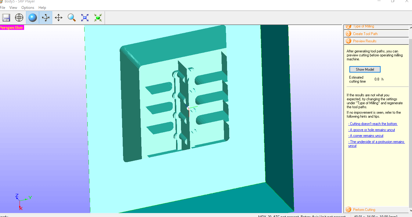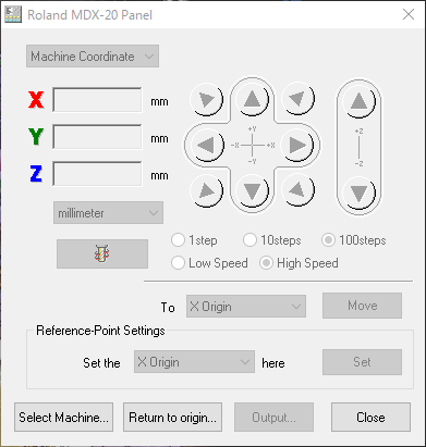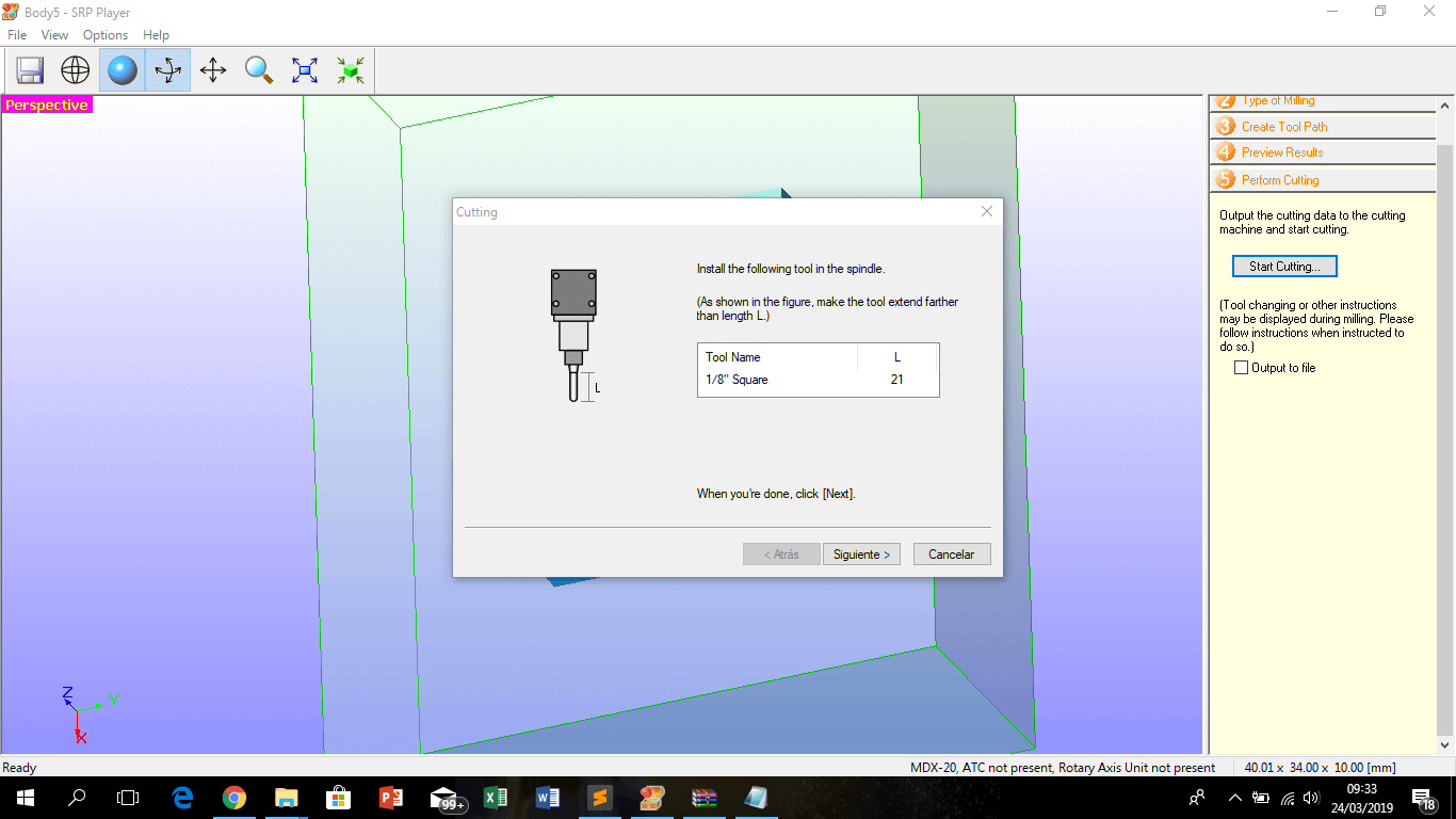Click on "5. Perform Cutting", and click on "Start Cutting"; then go to the Roland MDX 20 Panel, set up the machine, verify that the ports are the same and then send the job using output option.