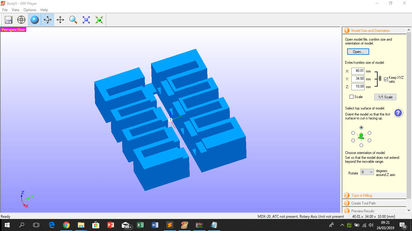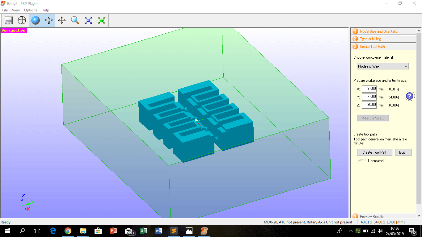 Another modification was imposed for the size of the wax block and the distances between the limits of the block and the boundaries of the piece, that is, the software needs a certain distance between the body and the block to generate a coherent toolpath. Therefore, I reduced the long size of the piece.