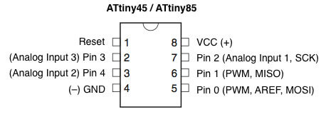 For design the schematic is important to know the pinout of the micrichip: So, in this example I connect the PWM output (for control the servo, the others outputs are ground and current) of the servo with the pin 3 (physically the pin 2) of the Attiny 45.