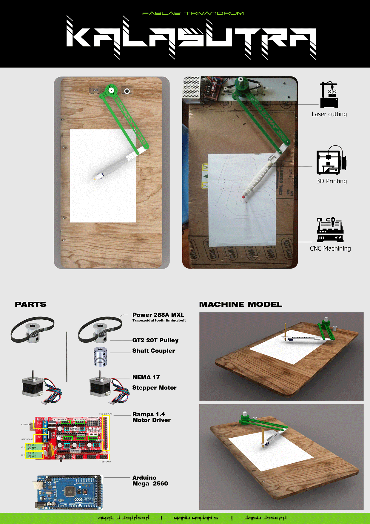 It was decided to build a machine similar to a normal Pantograph. The machine has 2 degrees of freedom. The rotational movement of the stepper is converted to the desired translational displacements by means of interconnected straight link mechanism connected in parallelogram geometry.
