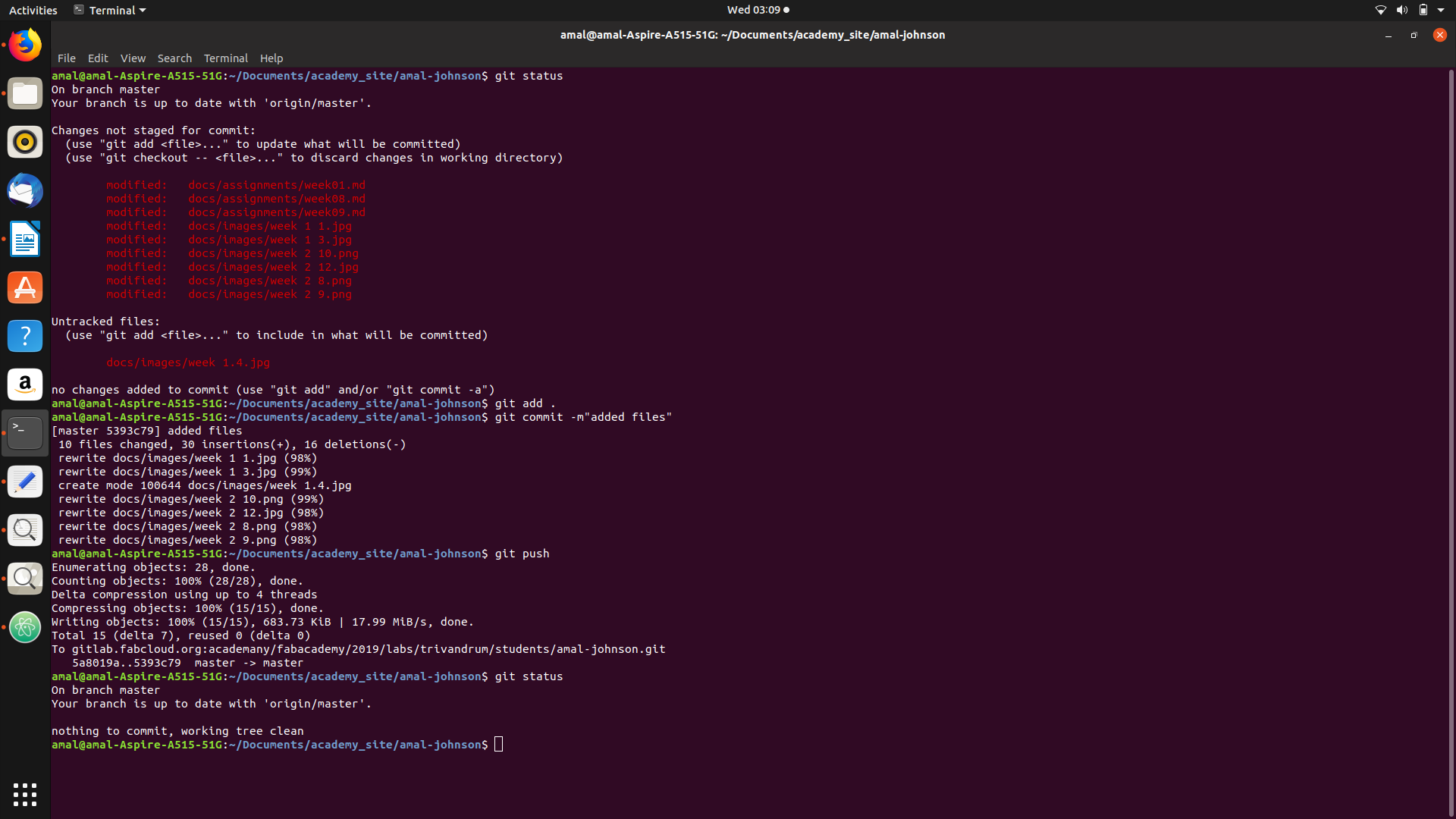 And finally to know about the git I used the command “git status” and for adding the files to git I used “git add .” and to commit it i used “git commit” followed by the message to commit enclosed by inverted commas and finally i added to the site by using ‘git push.’