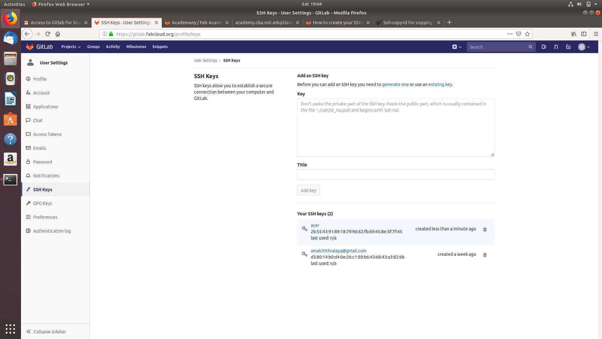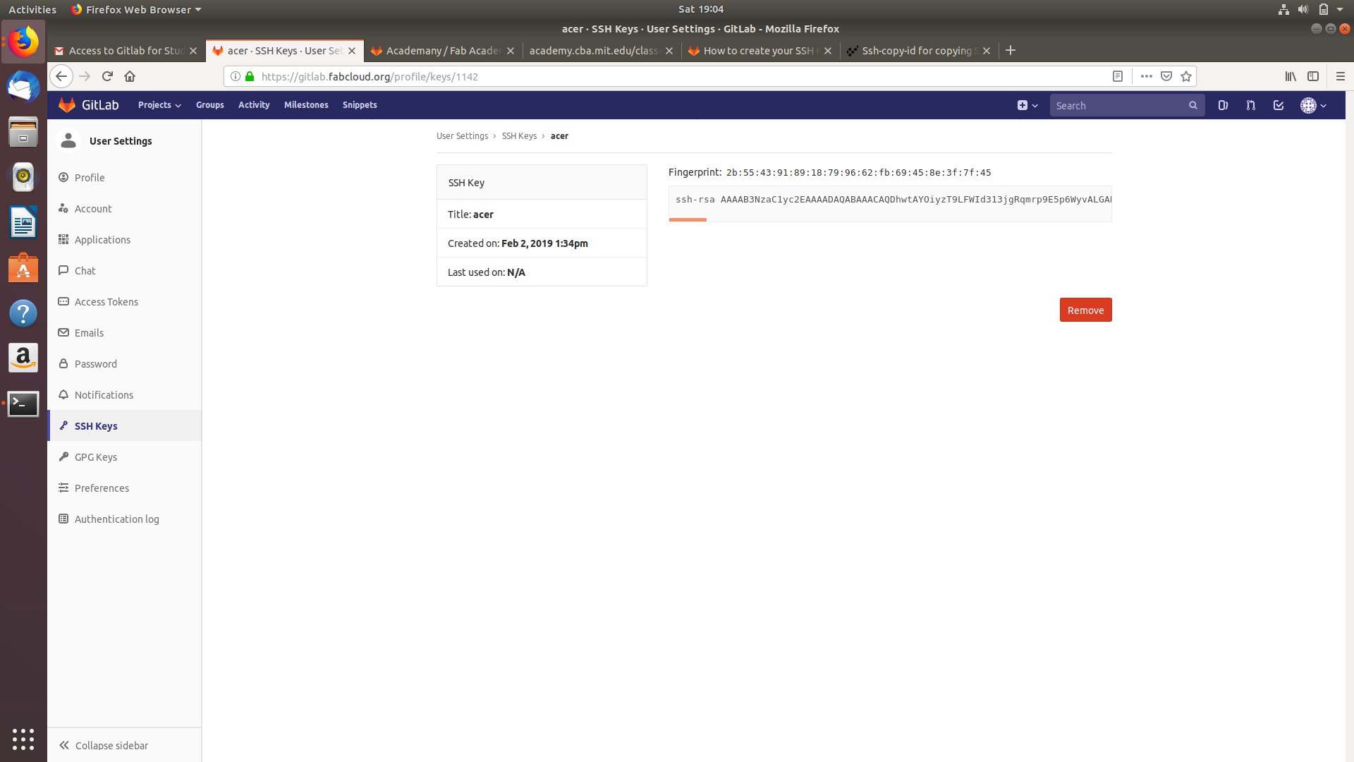 6) Copy the SSH key generated to the FabCloud account.