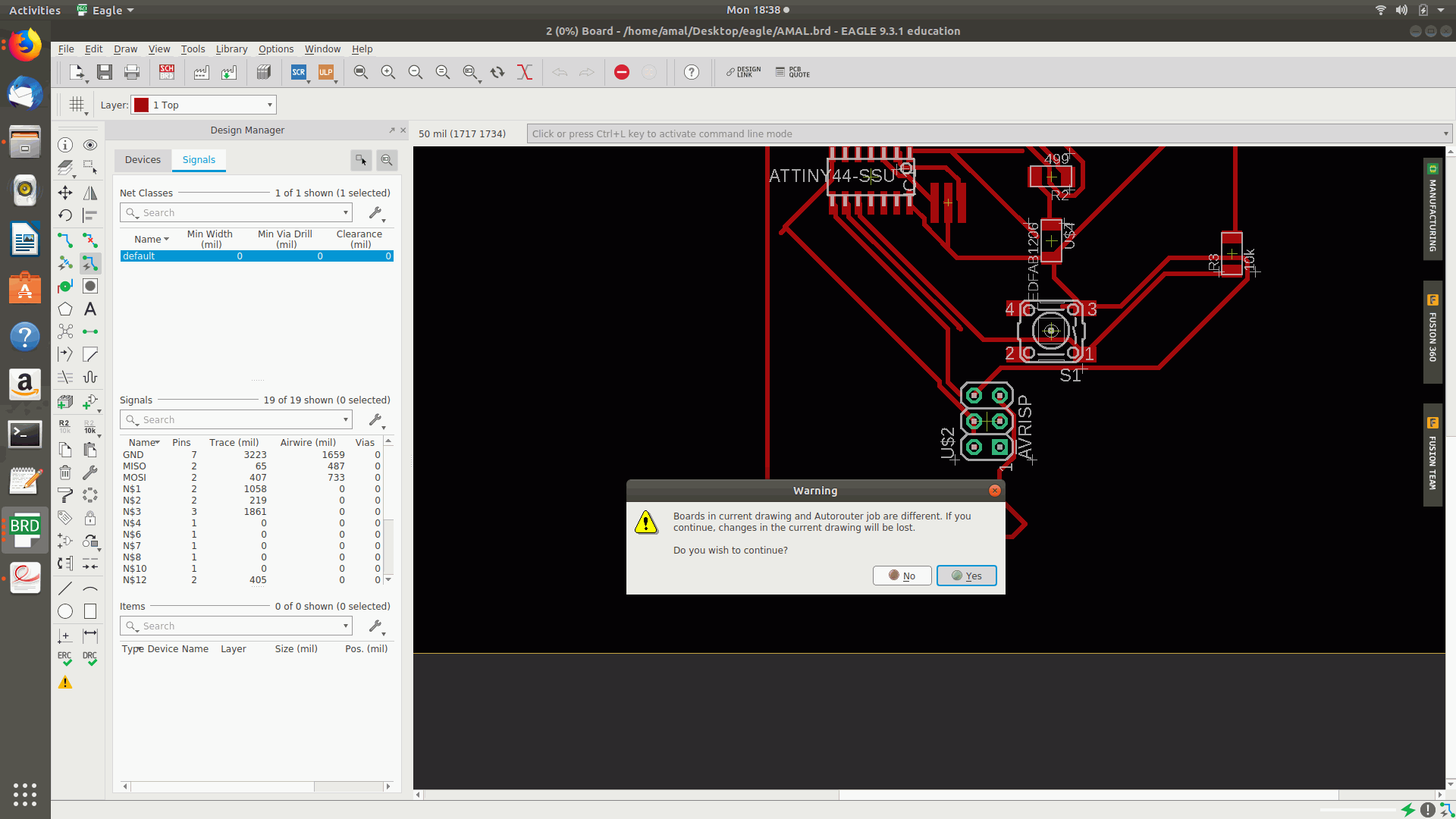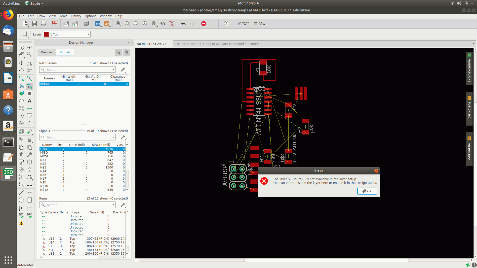 9.Then I rearranged the components since some of the components went unrouted and then I applied the autoroute option was selected from the tool option but an error occurred showing to disable the layer or to assign the design rule .