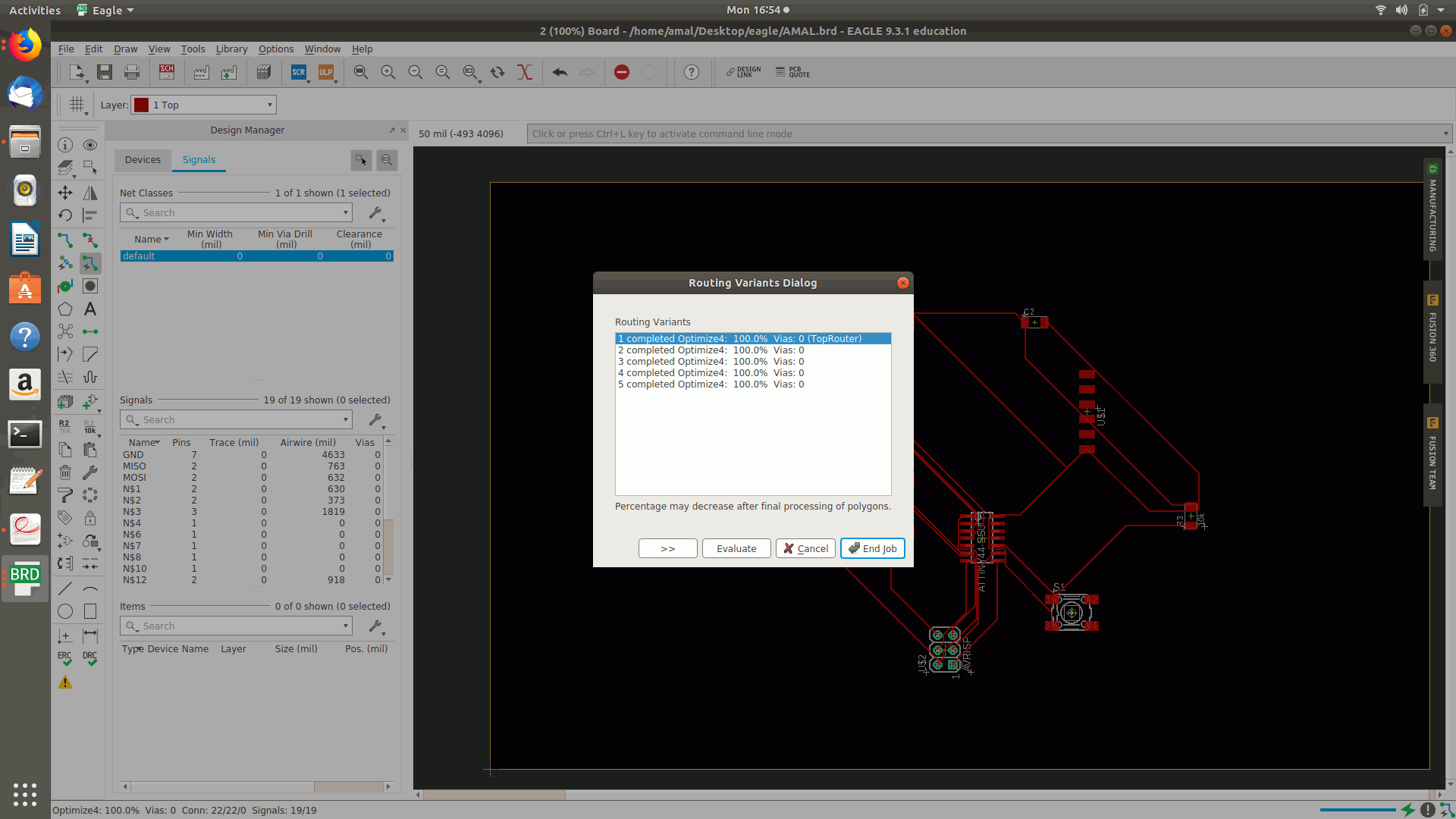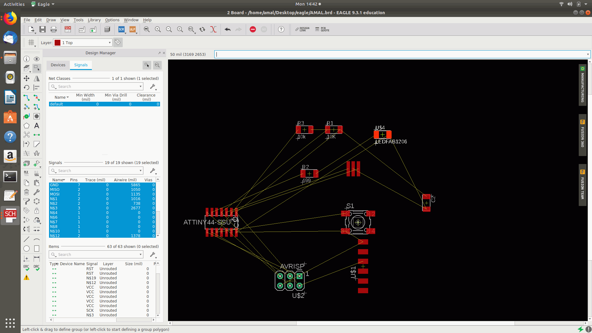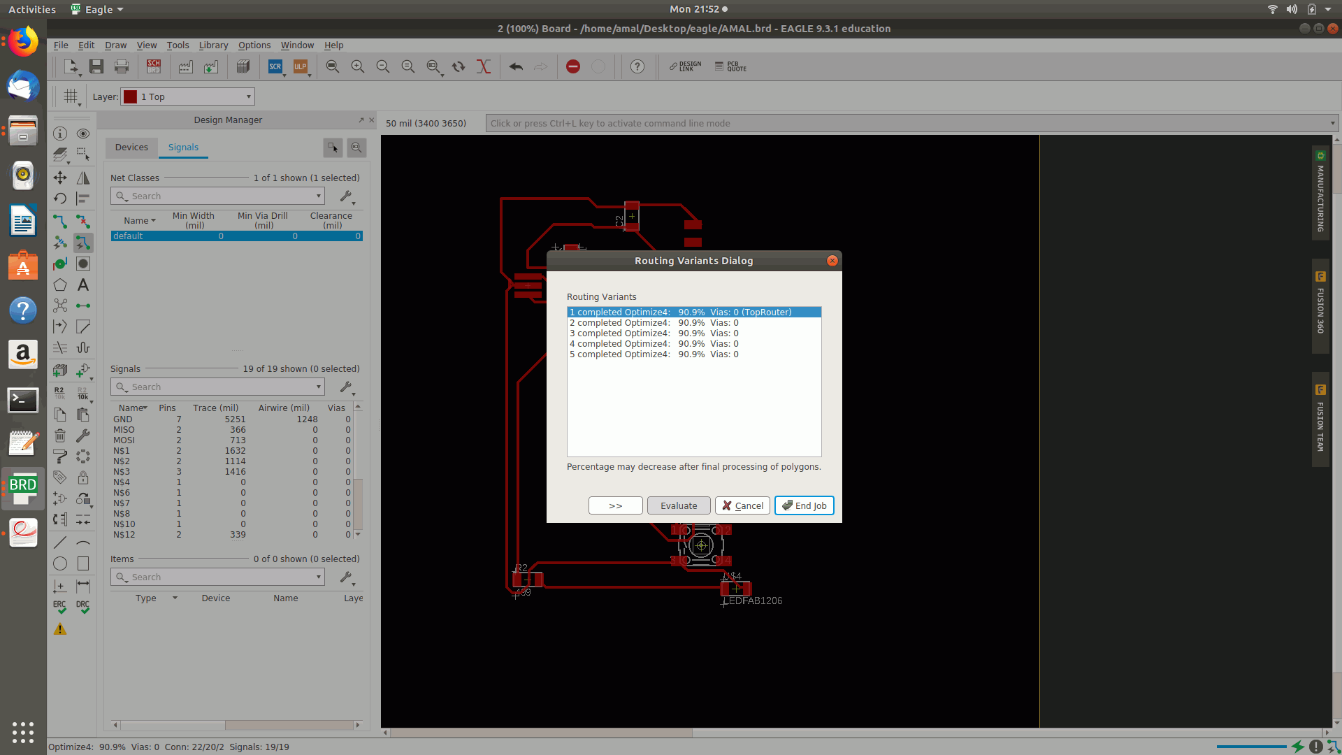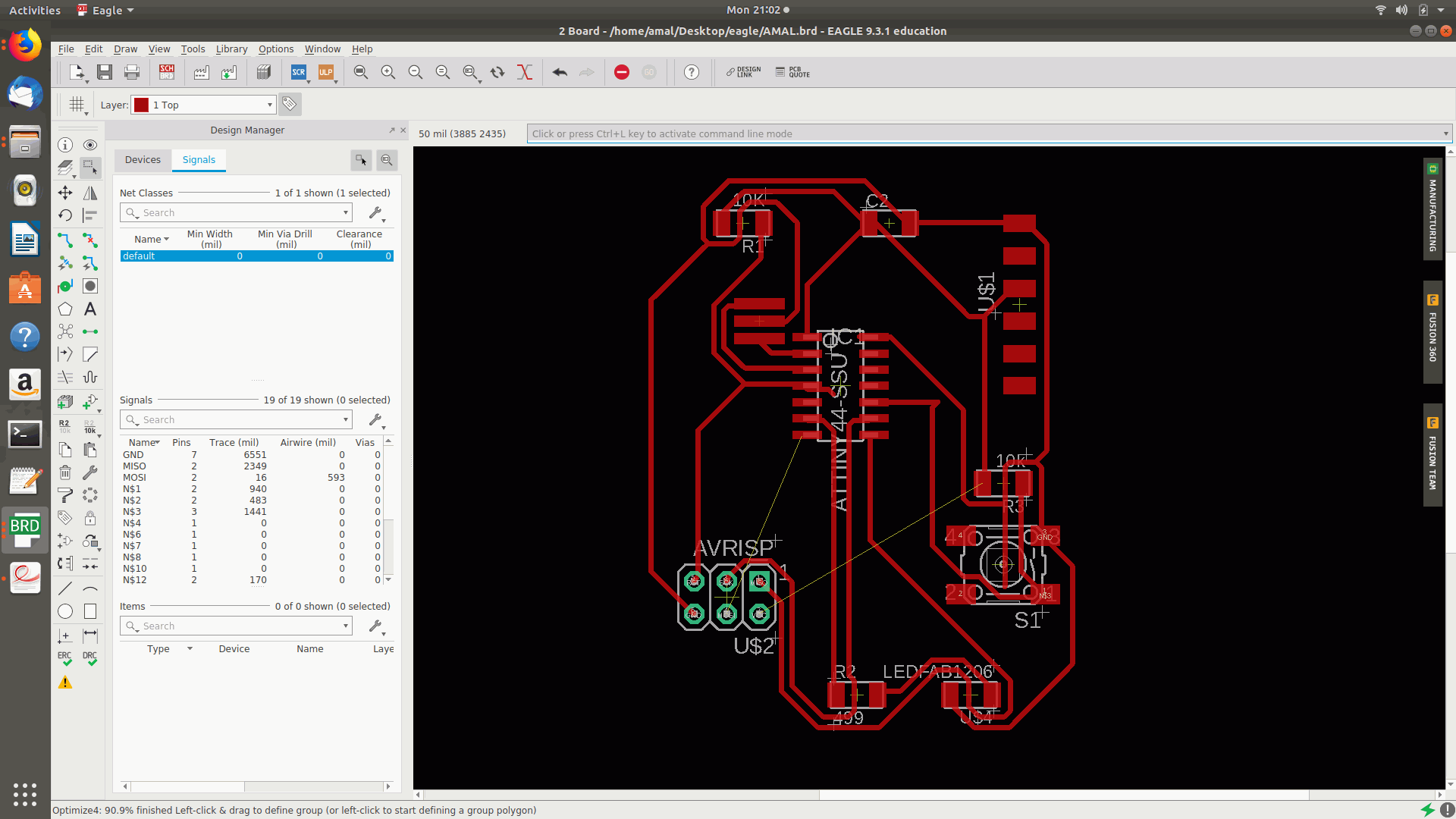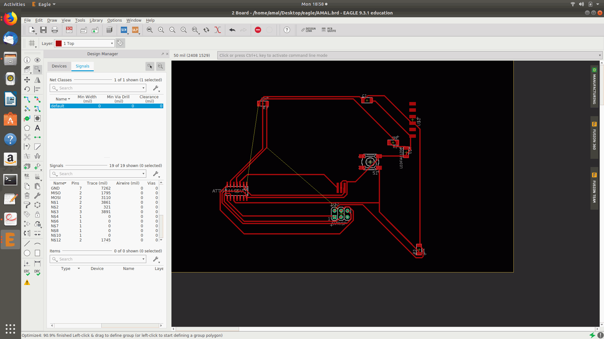 12.Then again tried as many times with different placements of the components in different directions and autoroutes and the top routed percentage was on 90.8% and the after selected the layer and turned off the visible layers other that top,bottom,pads etc and saved the image as png and the followed by making the border for the board.
