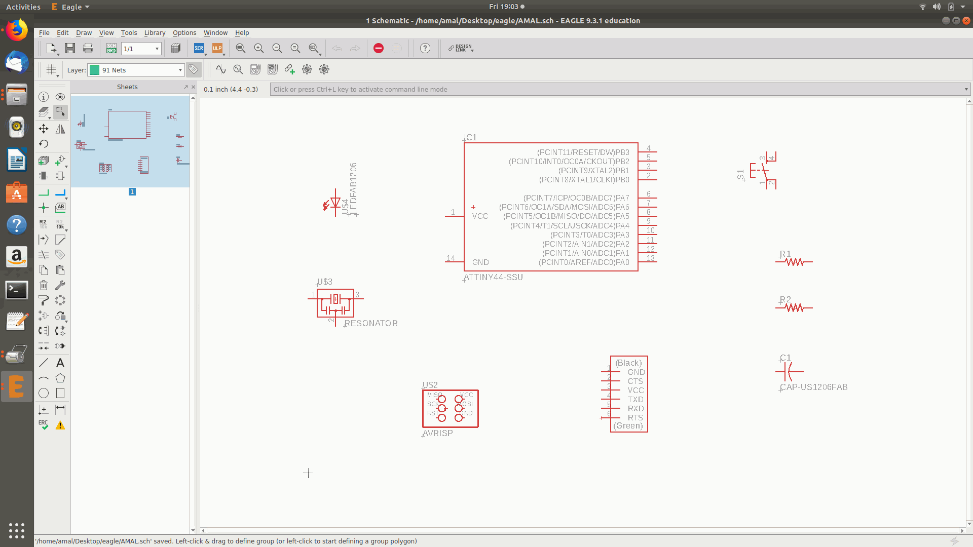 6.After that I arranged the components and named the connections like VCC,MOSI,MISO,GND etc and entered the values of the resistor and capaitor and the autojoin was formed.
