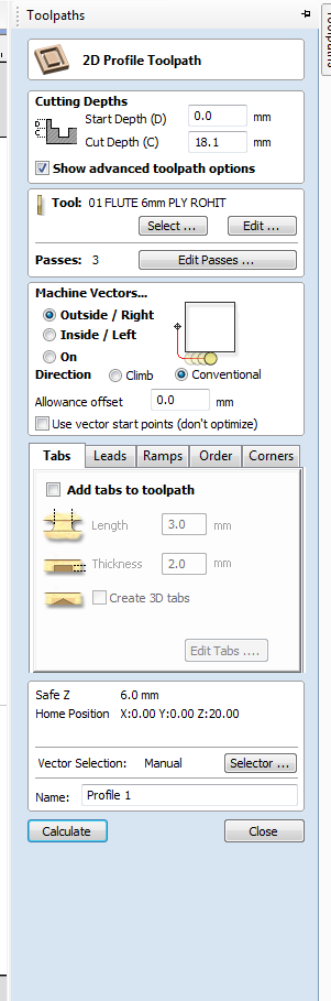 I selected the inner cuts to cut first as profile 1 and the rest of the outsider cut as profile as the order of cutting