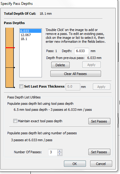 I have selected the depth as 18.1 mm as cut depth and selected 6.5 mm as per pass cut depth(it will automatically defines the cut as 3 pass)