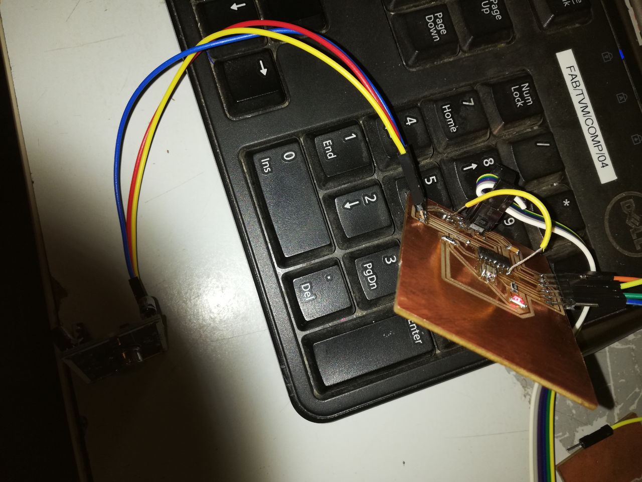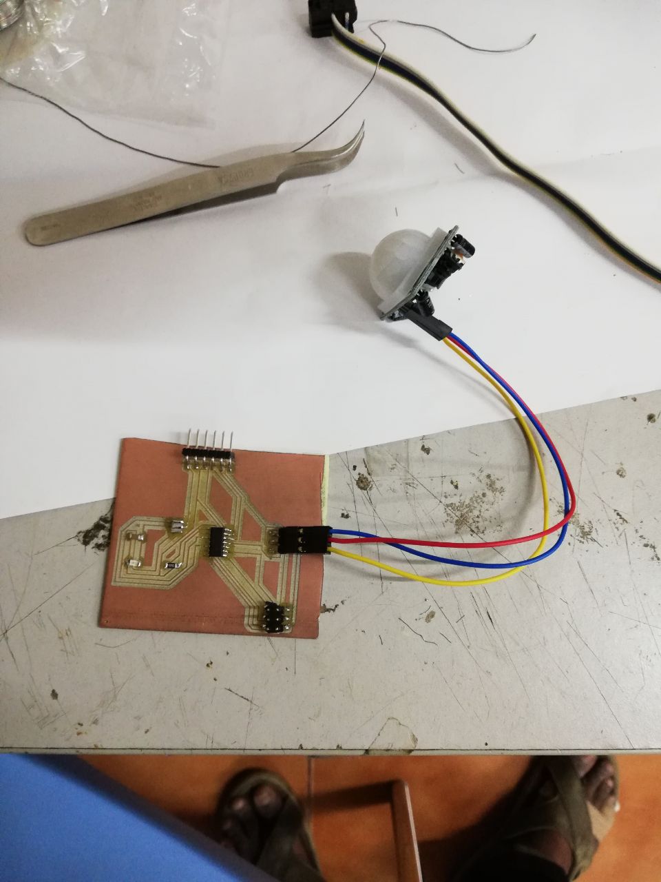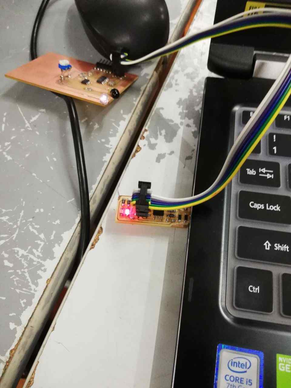 8.After soldering all the components I manged to program it by using arduino ide and connected to the programmer which was made during the electronics production week through AVIRSP headder.