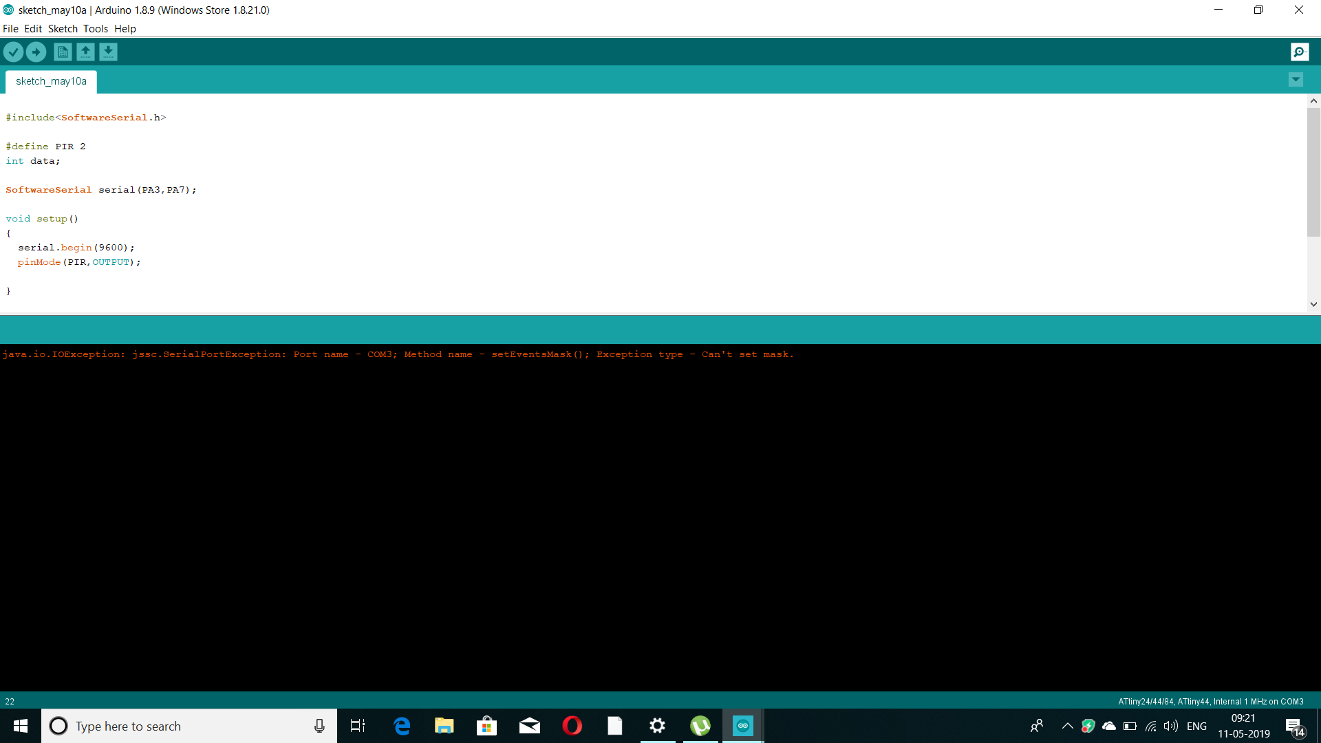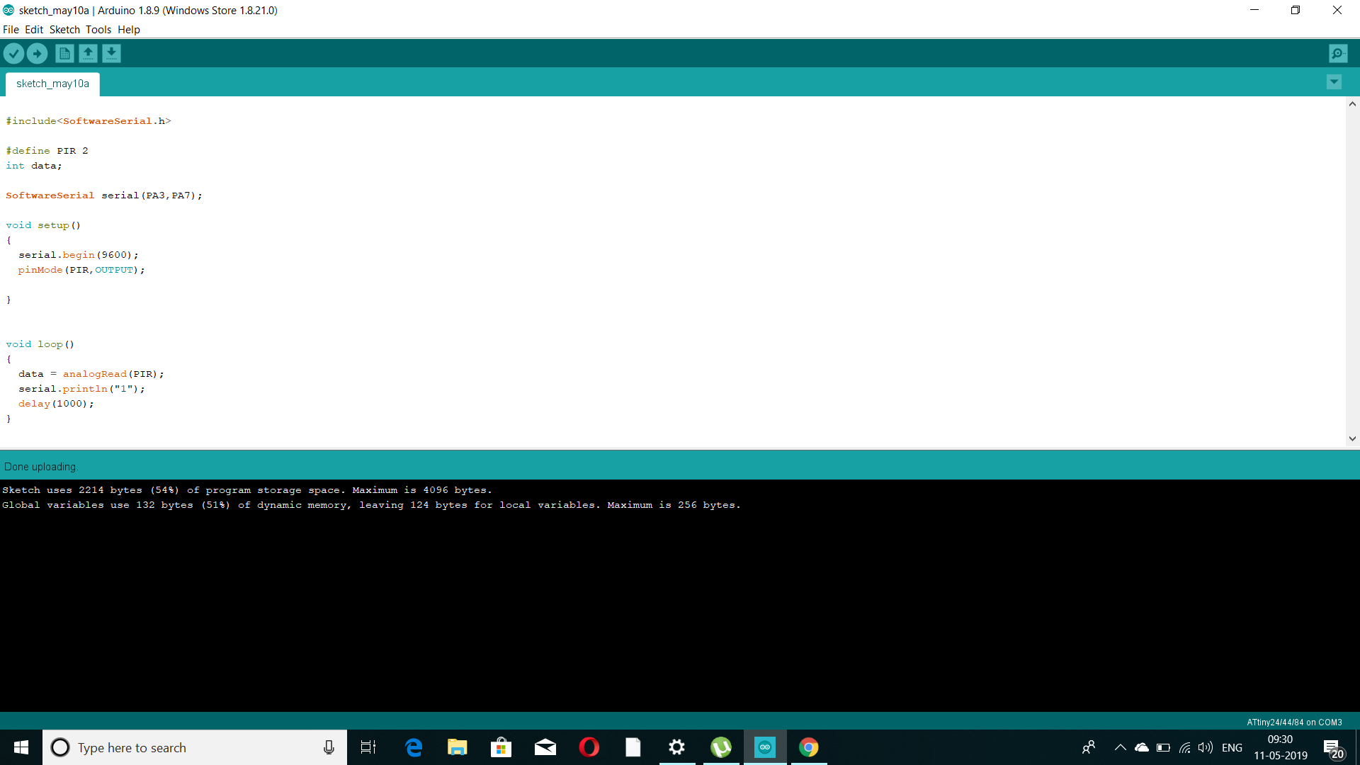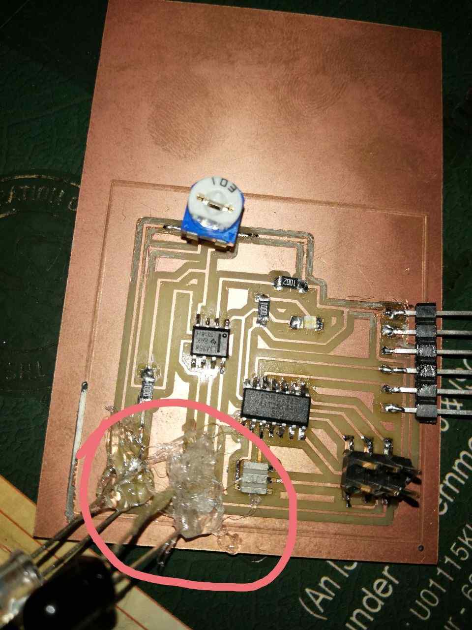 8.After soldering all the components I manged to program it by using arduino ide and connected to the programmer which was made during the electronics production week through AVIRSP headder.