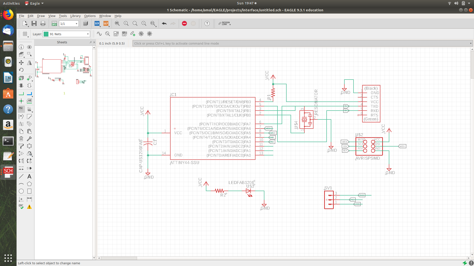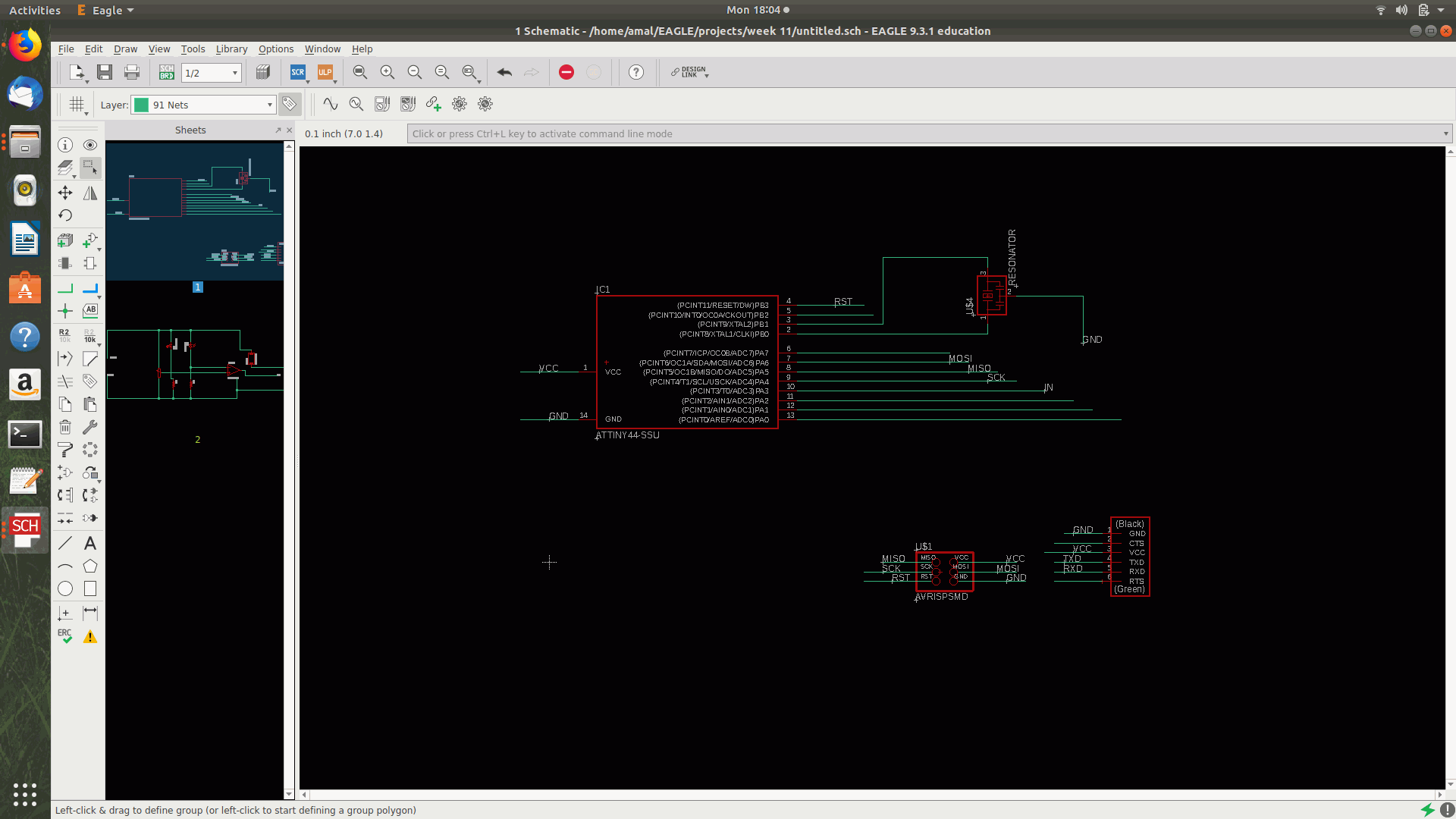 1.On the first sheet I draw the basic connections from ATTINY 44 to ftdi and avrisp headers and the basic circuit on the second sheet.