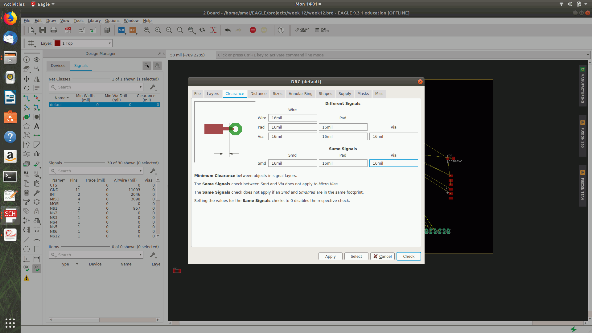 After that i had given the design rules as 16 mill and the clearance as 16 mill