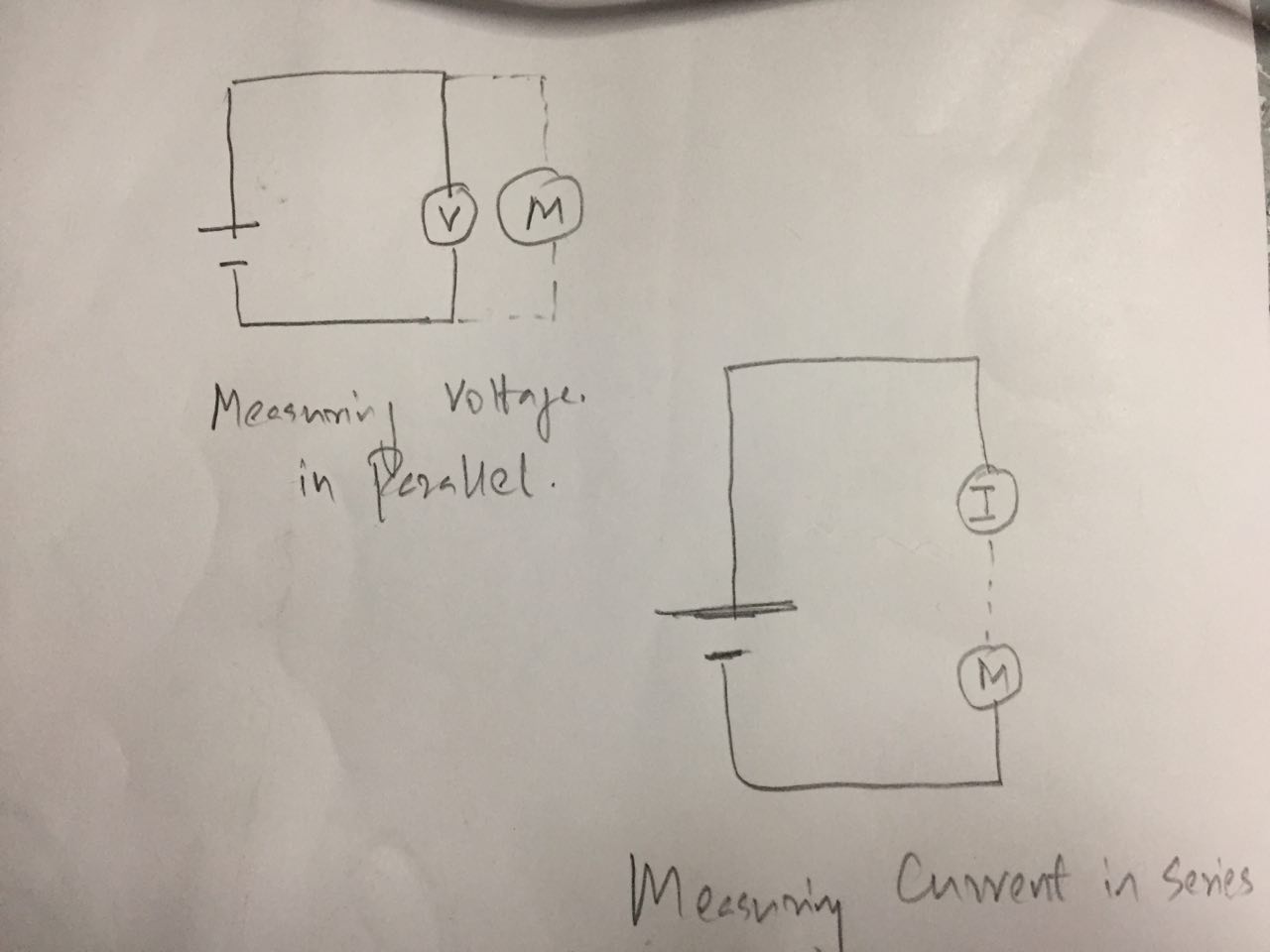 To measure current drawn in a circuit/electronic component a Multimeter has to be connected in series to the circuit. If we are measuring Voltage we connect the multimeter in parallel position.