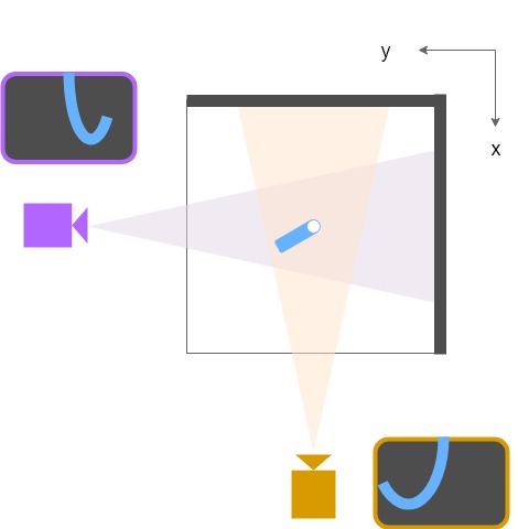 Based on 2 perpendiculars images, it is possible to compute the position of each point of my soft robot line: d2=x2+y2 and a=atan(x/y).