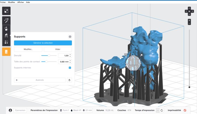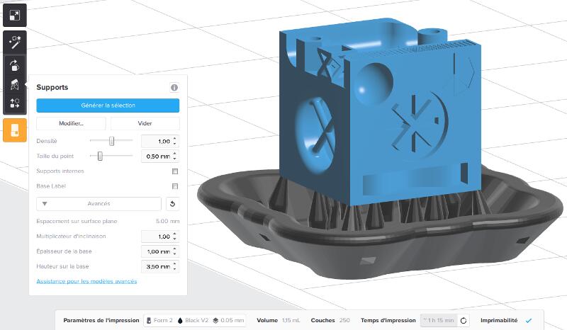 However, I tested the Formalabs slicer with my part (which comes from a research project). There are nice wizards and tutorial to guide me through the slicer. The main difference with the Prusa slicer is for the support! It is very fun to do and very intuitive. For my piece, I would need a lot of support, and I am afraid that some parts are too thin. However, it was fun to test!