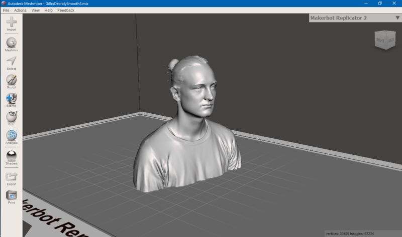 I was scanned by an Artec scanner at a prototyping show. The quality was excellent, but it requires a little bit of post-processing before being printed. I already this post-processing before the fab academy. I used Meshmixer, and more specifically smoothing tools of the sculpt menu.