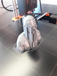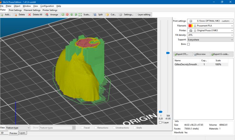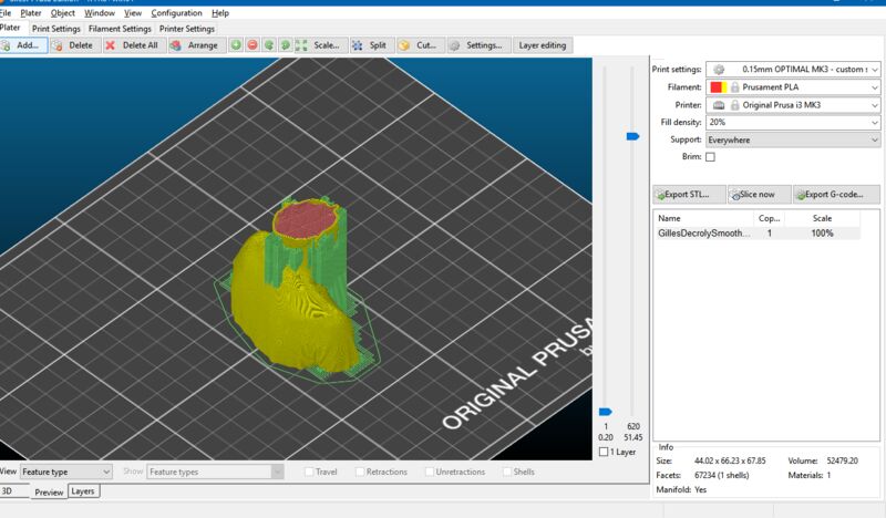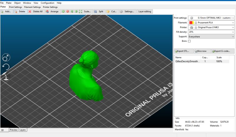 I can export the STL from meshmixer and slice my model. I need to use supports given the complex geometry of my head. Note that you have to make sure that the bottom is flat! The slicer has a nice function for this.