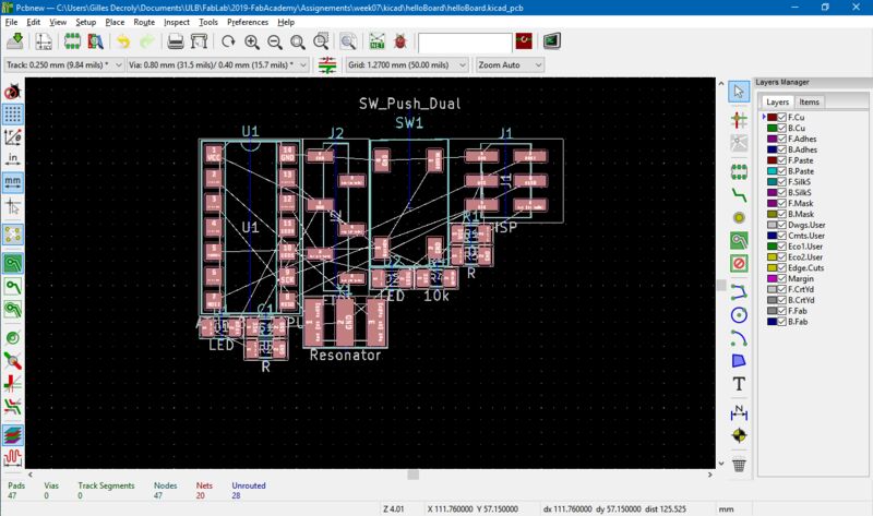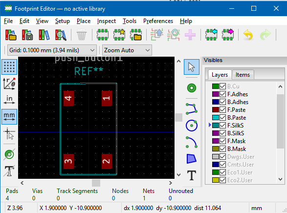 I also have to create my custom footprint for the push button, since it is not in the basic libraries. Here is a tuto on how to do it. I use first the values of the datasheet, but I’ll have to adapt this later… Finally, here is a tuto on how to save the new footprint.
