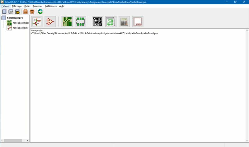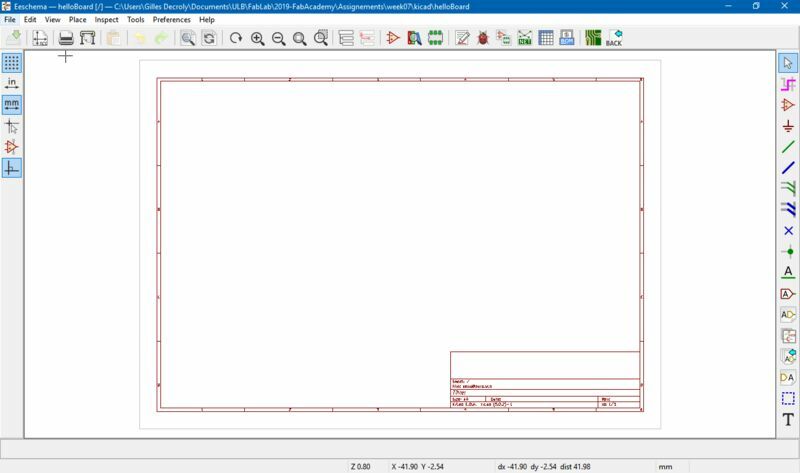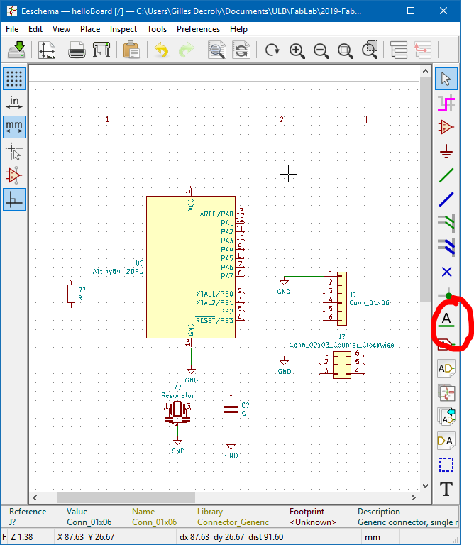 We have the ATMEL Tiny84A-SSU in the fab lab. I found it in the schematics library MCU_microchip_ATmega > ATtiny84-PU. It is the same chip that ATtiny44 with more memory. FOr the other components, I use basic resistor, resonator, pin headers and capacitor. I will manage the traces. I only learn when I am finished that there s a custom library for KiCAD containing all fab academy components.. Next step: placing the wires. I use dedicated elements for ground (GND) and the 5V power (VCC). It avoids to use too much wires. It is also possible to use labels. Be carefull to place them at the extremity of the wires. Two wires with the same label are electrically connected.